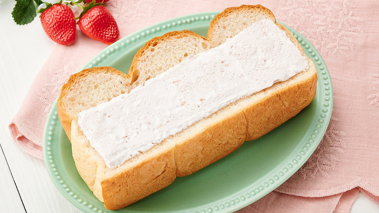 厚みのあるふんわりした食感のパンに、いちごホイップをぬった、ボリュームのあるパンです。