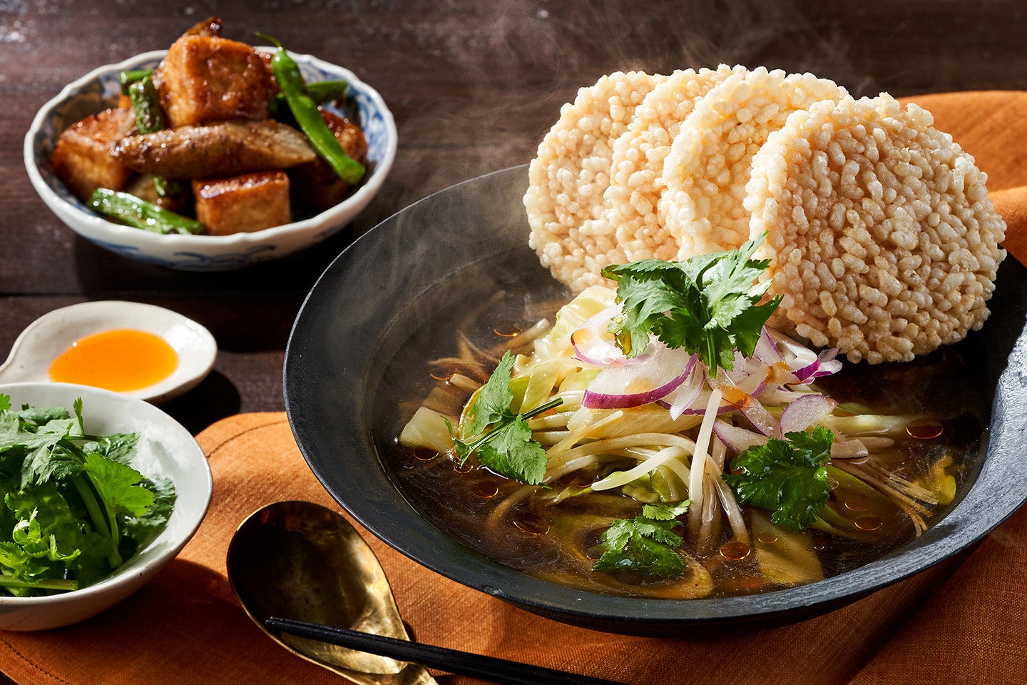 主菜は、ご自宅ではなかなか食べられないサクサクおこげを、野菜たっぷりのスープに浸して食べるベジスープ。パクチーとチリオイルがアクセントになった本格的な味わいです。