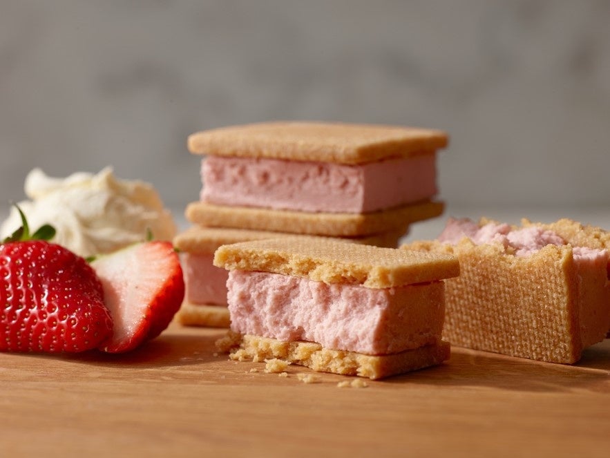 北海道産生クリームとオーストラリア産クリームチーズ、とちおとめ果汁をブレンドしじっくりと低温で焼き上げたベイクドチーズケーキをしっとりとしたサブレでサンドしました。季節限定のお味です。