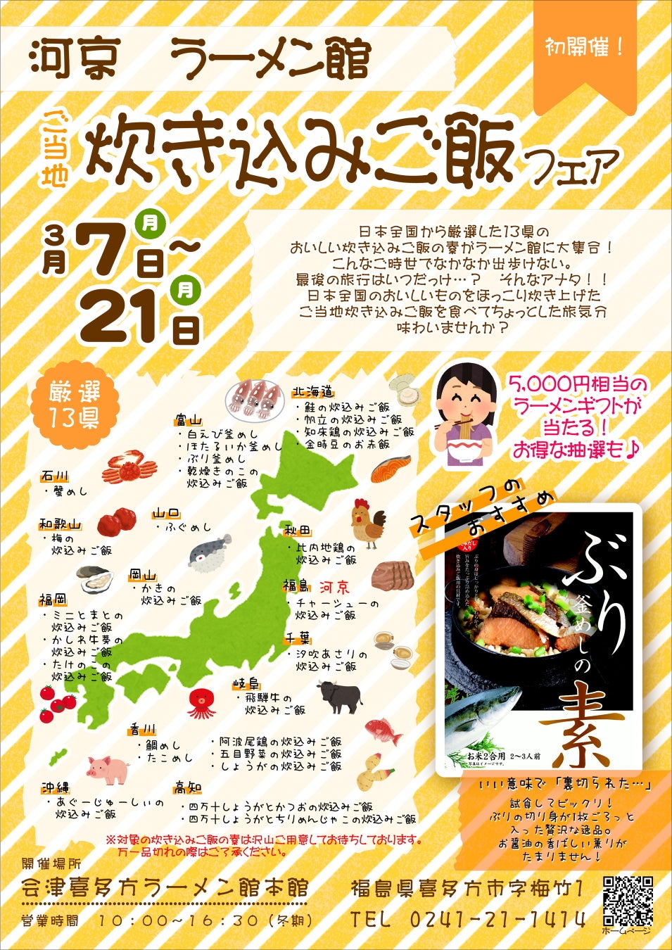 株式会社河京 会津喜多方ラーメン館本館(本社:福島県喜多方市、代表取締役:佐藤富次郎)は、日本全国から厳選した13県の炊き込みご飯を集めた「ご当地炊き込みご飯フェア」を2022年3月7日(月)より開催致します。