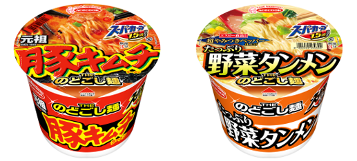 ① パワフルな味わいの「豚キムチ」とやみつき感溢れる味わいの「野菜タンメン」が新パッケージにリニューアル!