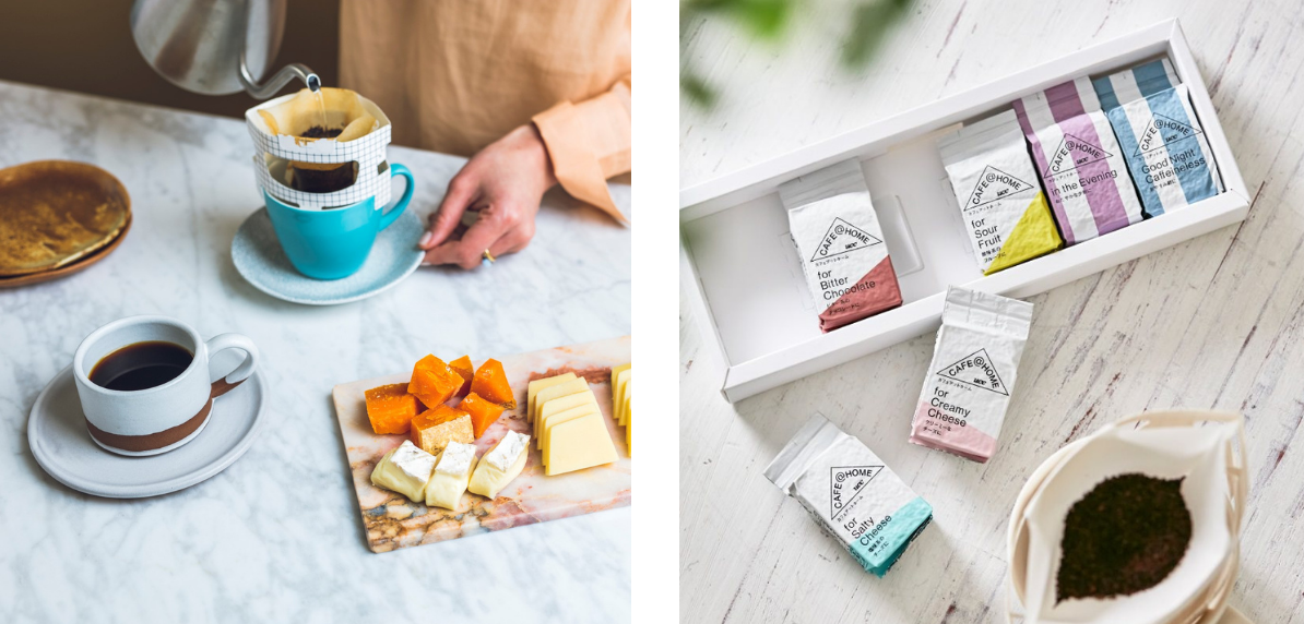 「CAFE@HOME」は、“私にぴったりのコーヒーに出会うことができる”“私らしいコーヒースタイルを見つけることができる”をコンセプトに、新しいコーヒーのライフスタイルを提案するブランド「COFFEE STYLE UCC」の主力シリーズです。コーヒーの産地や品種などではなく、チョコレート、チーズやフルーツなどの食べ物と合わせた「Food with Coffee」や、時間帯やシーンなどライフスタイルに合わせた「Life with Coffee」といったテーマで各商品を展開し、コーヒーの新しい楽しみ方を提案しています。1杯分のコーヒーを真空包装でパッケージしているので、いつも袋を開けたばかりの、香りのいいコーヒーを楽しめます。