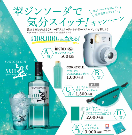 ワタミ株式会社(本社:東京都大田区、以下ワタミ)が展開する「ミライザカ」で、サントリー株式会社様が主催する゛「翠ジンソーダ」で気分スイッチ!キャンペーン“に参画いたします。3月1日(火)~4月27日(水)の期間中に「翠ジンソーダ」をご注文いただいたお客様へQRカードをお渡し、ゲームに挑戦して抽選で合計108,000名様に豪華景品が当たります。「ミライザカ」の居酒メシと「翠ジン」を使用した第三のソーダとの組み合わせを楽しみながら、ゲームに参加して豪華景品を手に入れてください。
