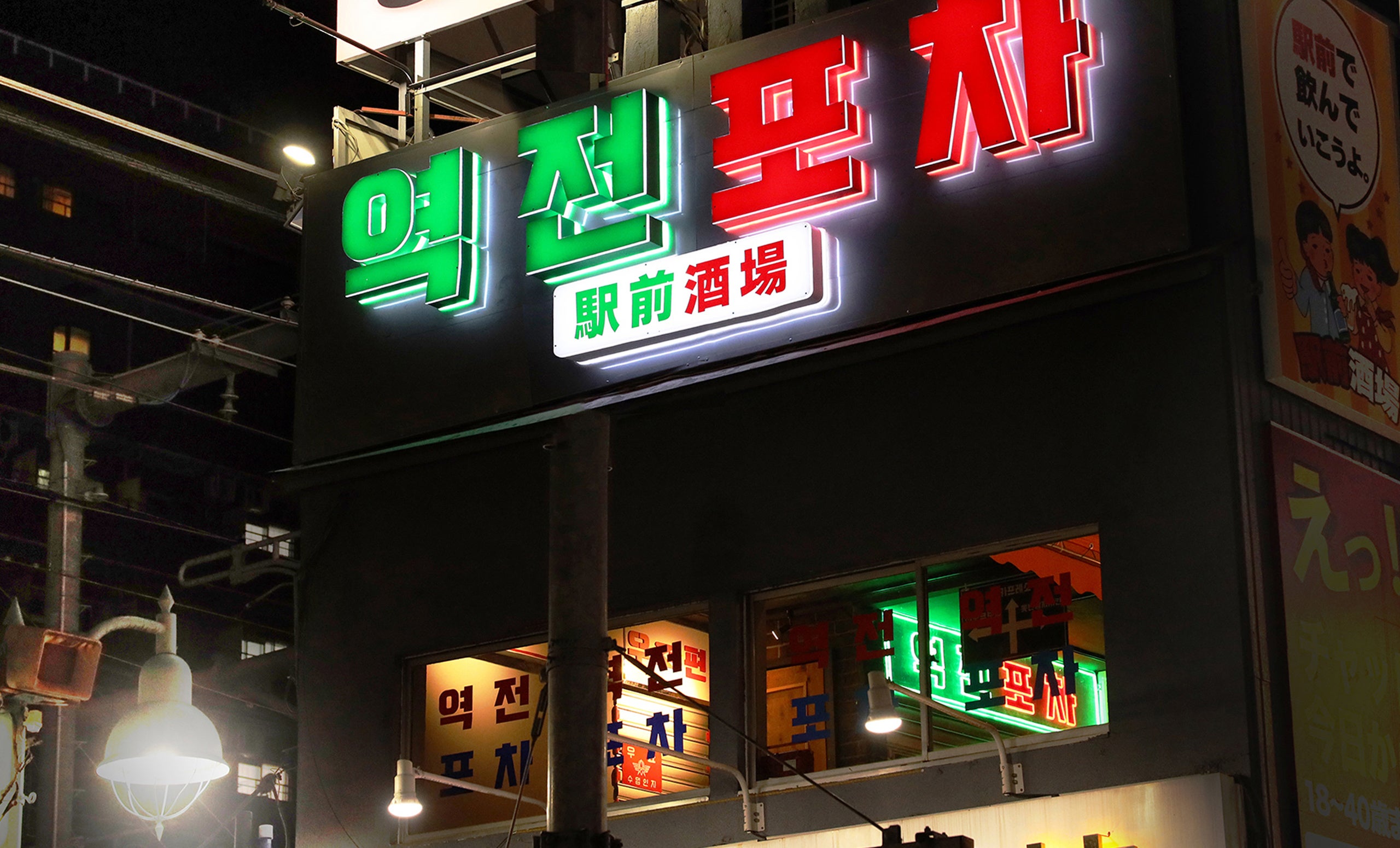 「駅前酒場」は1990年代の韓国風居酒屋をイメージした「レトロ居酒屋(韓国レトロポチャ)」です。「ポチャ」とは韓国の飲み屋屋台のことです。