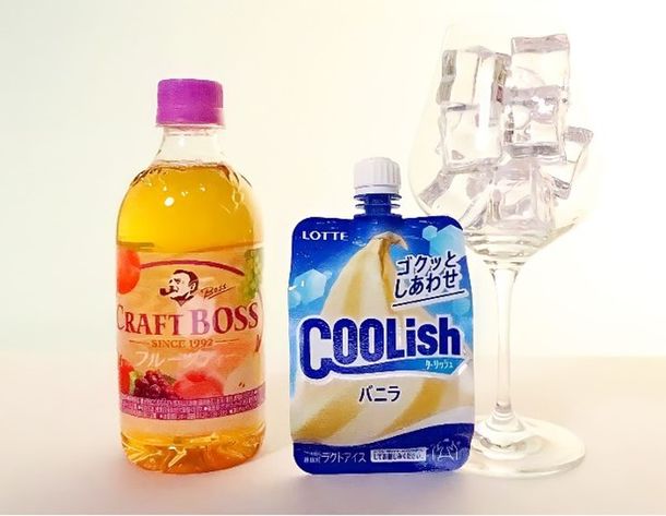 ロッテ「クーリッシュ バニラ」140mlに対して、サントリー「クラフトボス フルーツティー」を、よーく混ぜ合わせるだけ!(※クーリッシュ70mlに対して、クラフトボスフルーツティー100ml)