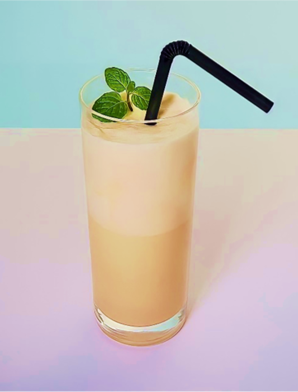 こちらは少し変化球。期間限定の『MOW PRIME バタークッキー&クリームチーズ』を使用しますが、同じ『モウ』のバニラ味と、市販のクリームチーズでも代替え可能!去年ブームとなった「チーズレモンティー」です!『クラフトボス レモンティー』の強い香りがグッド!ドリンクの上に白いアイスが乗るので、透明グラスで作ると、ビールみたいな見た目でかわいいです!