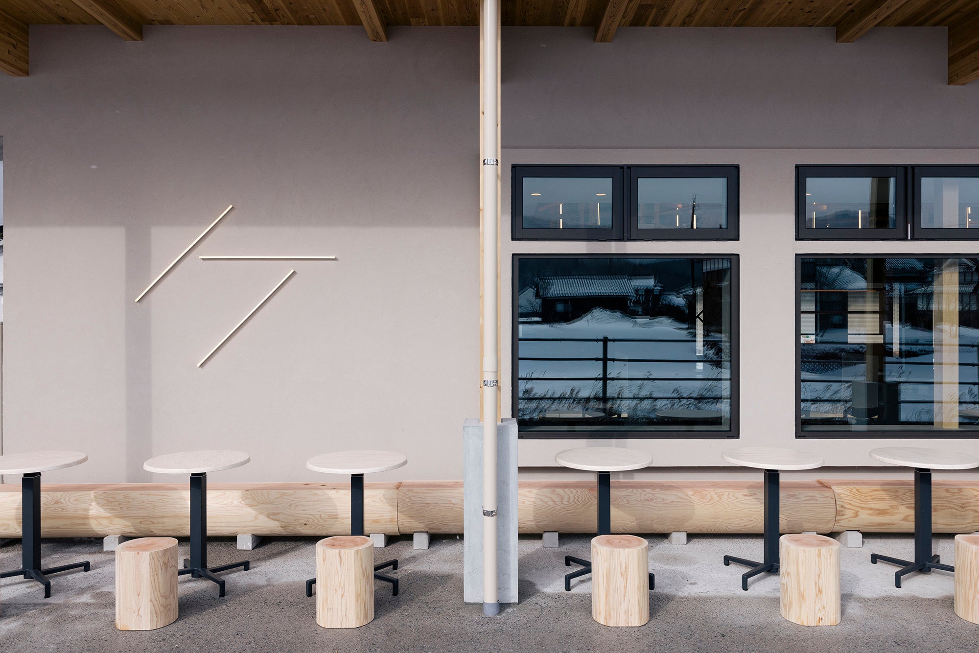 蒜山産の一枚板はシンボリックにテーブルの天板に使用しています。また、丸太をベンチやスツールなどに活用。丸太は、加工時に発生するCO2も少なく廃棄部分も最小限な、木材の中でも特にエコな材料です。木ならではの温かみのあるしつらえに仕上げています。