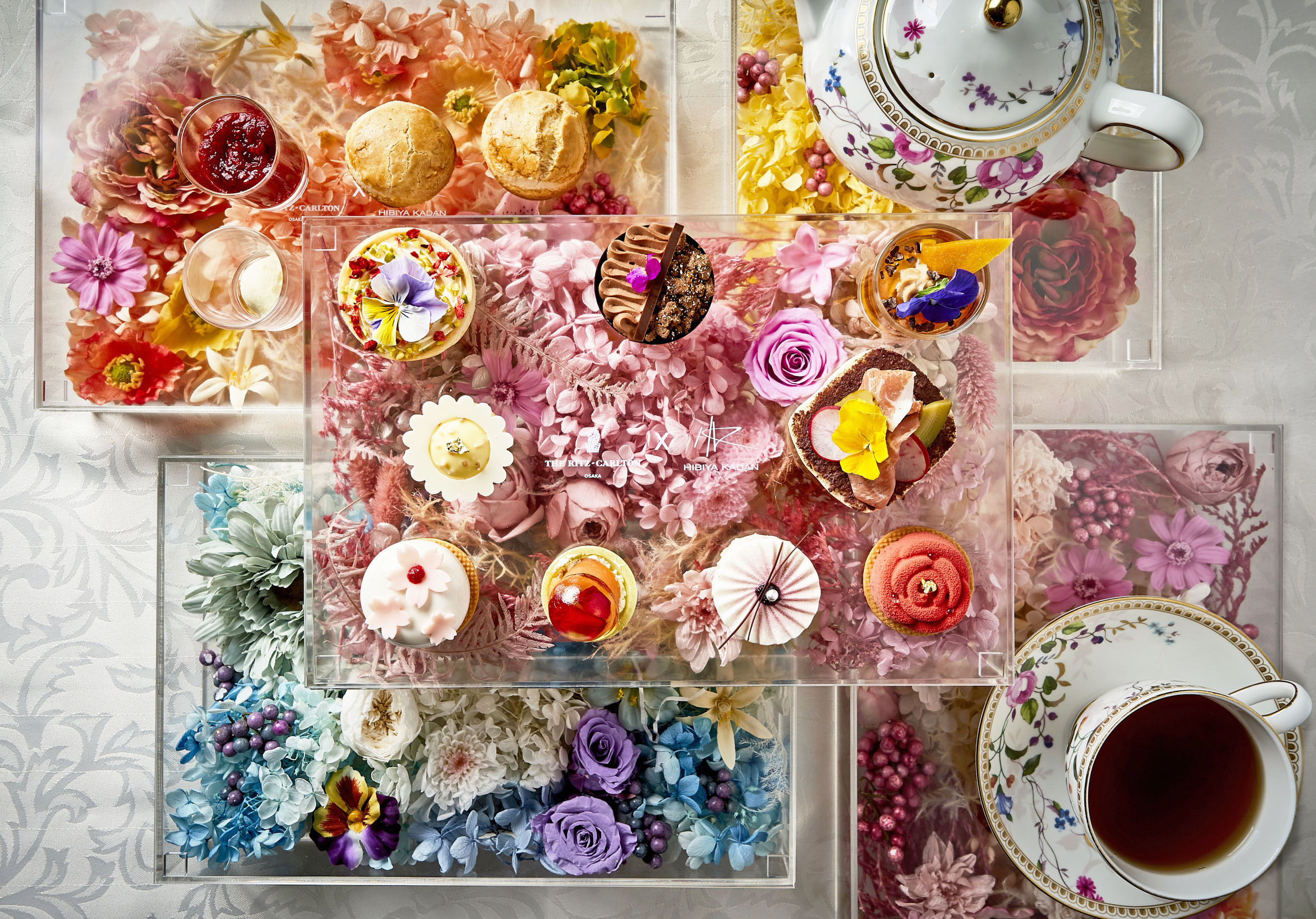 「フラワーアフタヌーンティーby日比谷花壇」では、日比谷花壇が誇るFLOWER CREATION ROOMのフラワーデザイナー 園川絢也が、今回の企画のために特別に、さまざまなプリザーブドフラワーやアーティフィシャルフラワーをアレンジし、アクリルケースに閉じ込めた、春らしいフラワーボックスを仕立てました。ザ・リッツ・カールトン大阪1階のザ・ロビーラウンジでは、このフラワーボックスの上に、ザ・リッツ・カールトン大阪のエグゼクティブペストリーシェフ ファビアン・マルタンが「花」をテーマにしたスイーツ5品とセイヴォリー4品をのせた、華やかなアフタヌーンティーが提供されます。スイーツはそれぞれ桜・スミレ・ポピー・薔薇・ラベンダーをイメージした見た目と味に仕上げられており、セイヴォリーにもエディブルフラワーがふんだんに使われています。お客様をお迎えするザ・ロビーラウンジの入口では、園川絢也が創作した華麗なフラワーディスプレイが楽しめ、会場では日比谷花壇がデザインした花柄のプレースマットと、花に囲まれた春いっぱいの世界観で、華やかな春の訪れを目と舌で感じる、心躍るアフタヌーンティータイムをお過ごしいただけます。