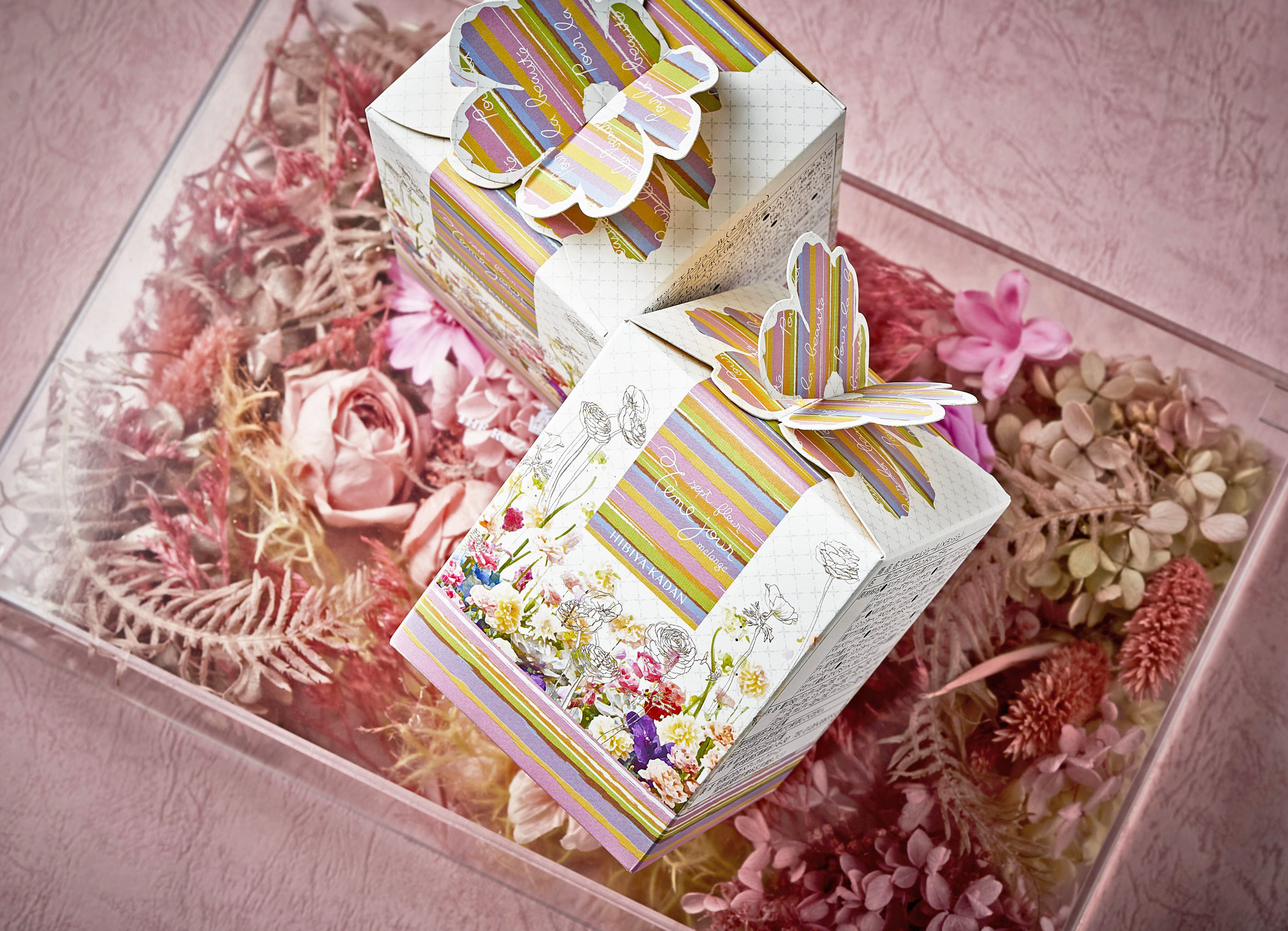 アフタヌーンティーをお楽しみいただいた後は、ホテル内1階にあるフラワーブティックで、アフタヌーンティーで使用されるフラワーボックス〔価格:22,000円(税込)〕(*アフタヌーンティーのご利用の方は10%オフ)を購入することもでき、華やかな空間でお腹も心も満たされた幸せな気分を、ご自宅にお持ち帰りいただき、インテリアとして長くお楽しみいただけます。また、1階のグルメショップでは、ご自宅でもアフタヌーンティーをお楽しみいただけるよう、日比谷花壇オリジナルのフローラルハーブを配合した7種類のブレンドハーブティー「7eme jour セッチエム ジュール」をお付けした、「フラワーアフタヌーンティーby日比谷花壇」〔価格:6,680円(税込)〕をテイクアウトで購入いただけます。ブレンドハーブティー「7eme jour セッチエム ジュール」〔価格:1,080円(税込)〕は単品でも購入いただけます。
