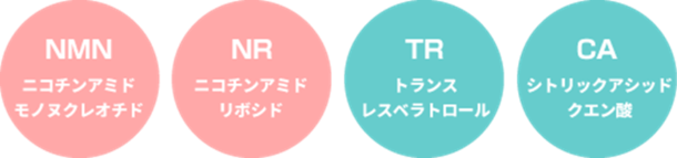 老化原因となる遺伝子損傷からの保護を行う細胞内のNAD+を増加させるNAD+前駆体のNRと、細胞内ミトコンドリアのケアを行う抗酸化成分のTRを中心に配合した、総合エイジングケアサプリメントです。