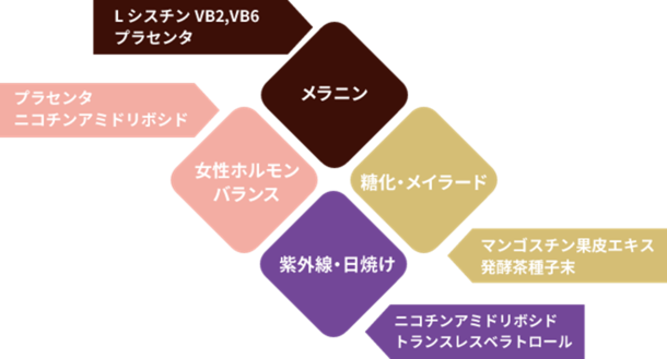 美白の維持に必要な、4つの汚肌原因にアプローチしていつまでも肌を白く美しくありたい方の食生活サポートを行うサプリメントです。