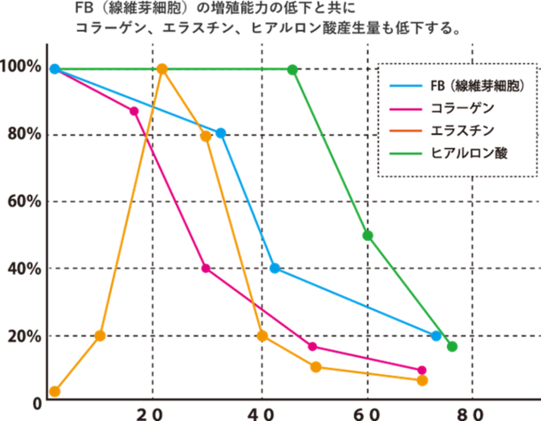 加齢と共にFBが低下し、FBが産生するコラーゲン、エラスチン、ヒアルロン酸の産生量が減少することがわかっています。