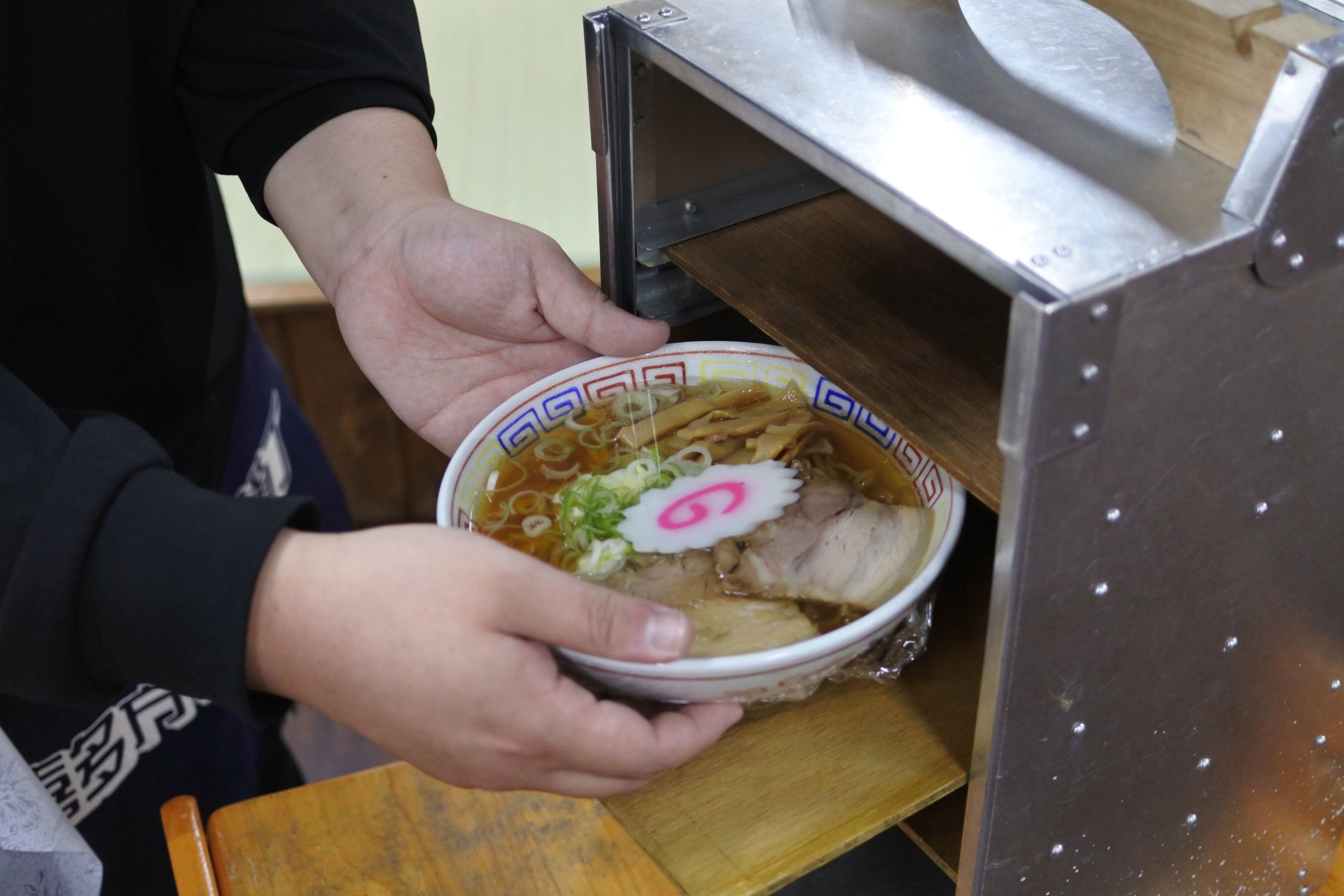 一杯の喜多方ラーメンを味わうことが出来る河京食堂。ラーメンの提供は「おかもち」に入って出前スタイル!