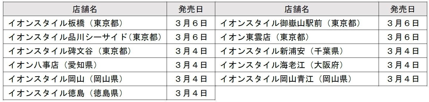 販売店舗:東京・千葉・愛知・大阪・岡山・徳島の「イオン」「イオンスタイル」11店舗
