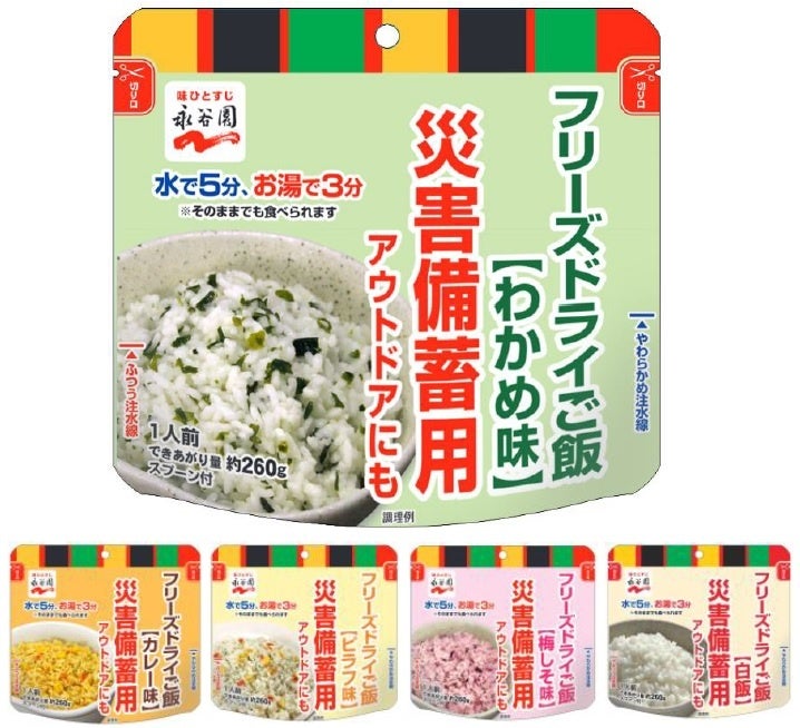 株式会社 永谷園(社長:五十嵐 仁、東京都港区)は、日常やアウトドアでお使いいただきながら、災害時にも役立つ商品である「フリーズドライご飯」「エー・ラベル(A-Label) あたためなくてもおいしいカレー 5年保存」をご案内いたします。どんな時でも「簡単に」「早く」「おいしく」食べることができ、「安全で安心」であることを念頭に置いて作られた長期保存が可能な商品です。