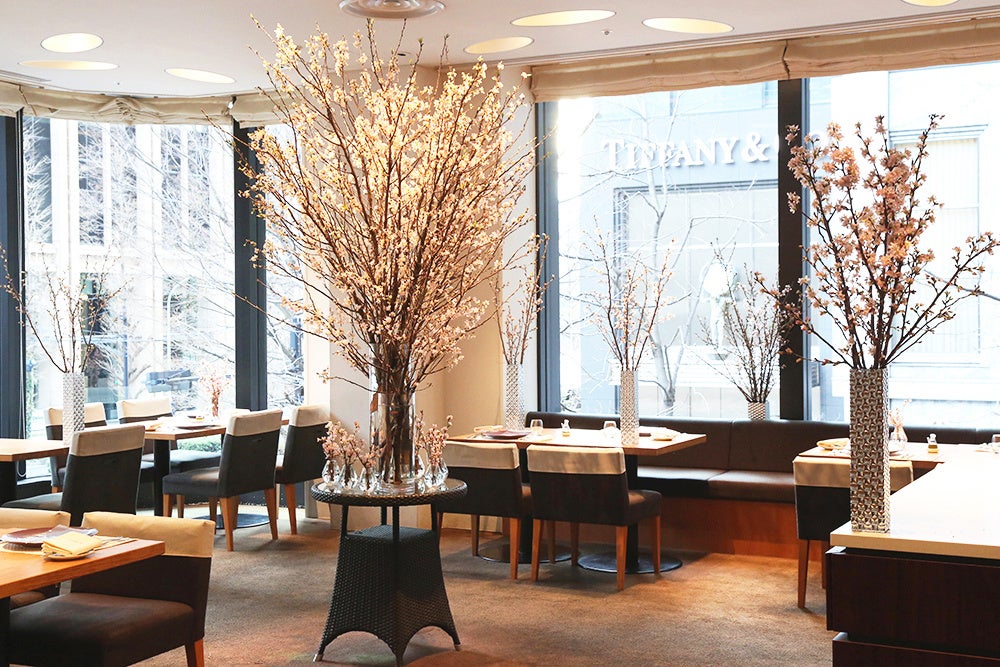 毎年同プランをご提供しておりますが、今年は店内の桜が仲通り側にもディスプレイされてさらに豪華にバージョンアップされ、さくらプランのコースも「桜」にこだわった内容になっています。お野菜いっぱいの美味しいフレンチをいただきながら暖かい店内で贅沢なお花見をお楽しみいただけます。 店内の桜は、共同経営をしている株式会社花弘の HANAHIRO CQ 丸の内店(同ビル 1 階)が 毎日メンテナンスをし、開催期間中は数種類の様々な桜をお楽しみいただく予定です。(開催当初は啓翁桜)