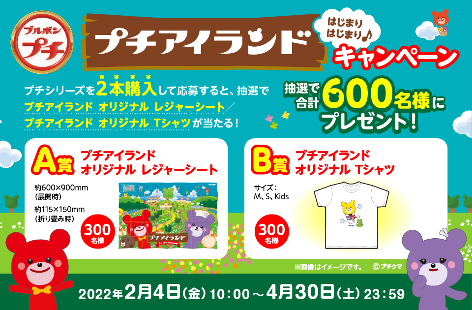 プチシリーズを2本購入したレシートを撮影し、キャンペーンサイトからその写真を送ることで応募できるクローズドキャンペーンです。「プチアイランド」のほのぼのとした世界観を活かしたレジャーシートやTシャツが当たるキャンペーンを展開しています。