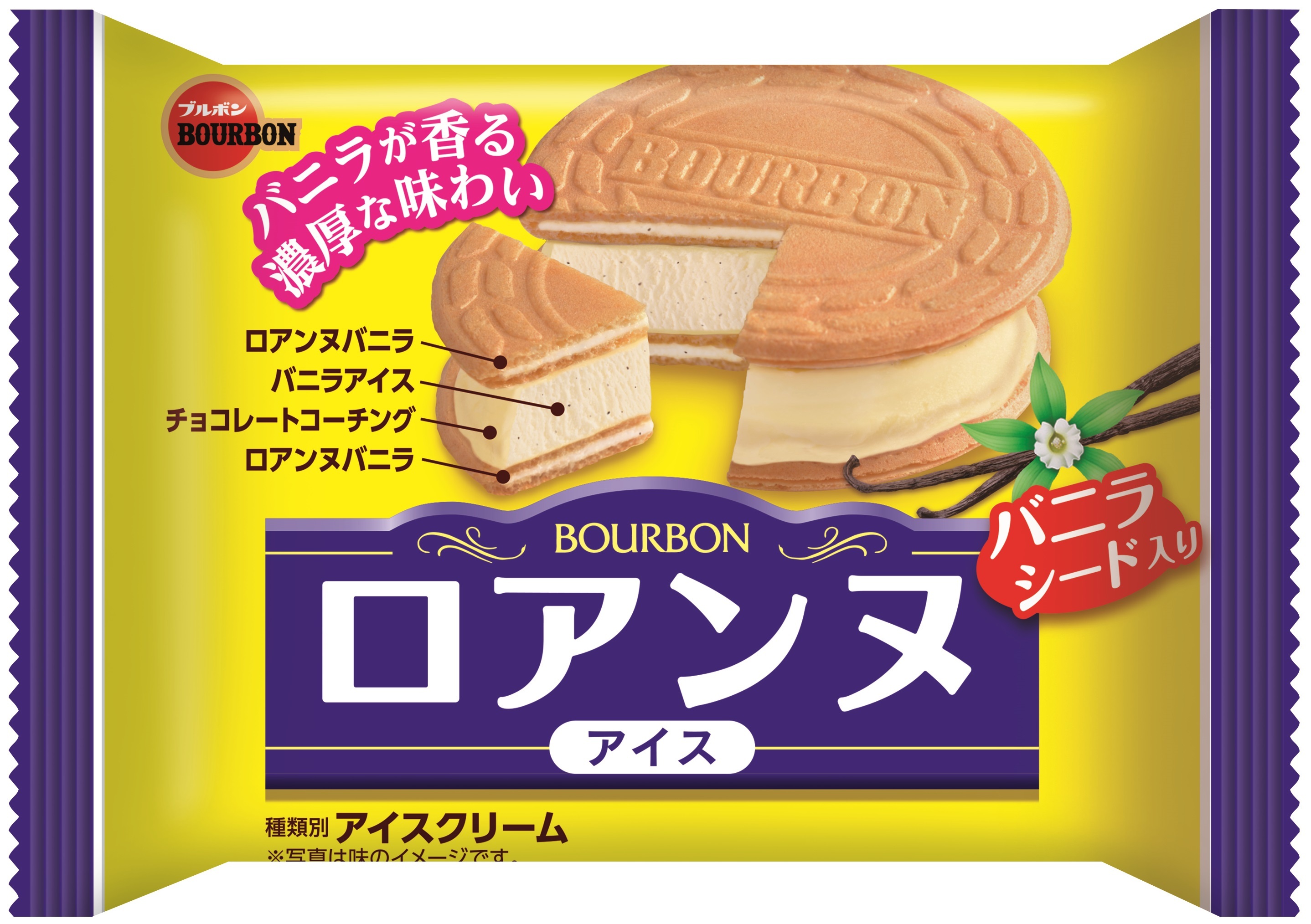 「ロアンヌアイス」は、バニラクリームをサンドした「ロアンヌ」でアイスクリームをはさんだサンドアイスです。アイスクリームはバニラシードを加えて濃厚に仕立て、さらにバニラ風味のホワイトチョコレートコーチングで包み、バニラのおいしさを存分に感じられるように仕上げました。リニューアルではアイスの配合を見直し、後味がすっきりとした食べやすいアイスにしました。「ロアンヌ」のサクッと軽い食感に加え、バニラの濃厚な味と香りをお楽しみいただけます。