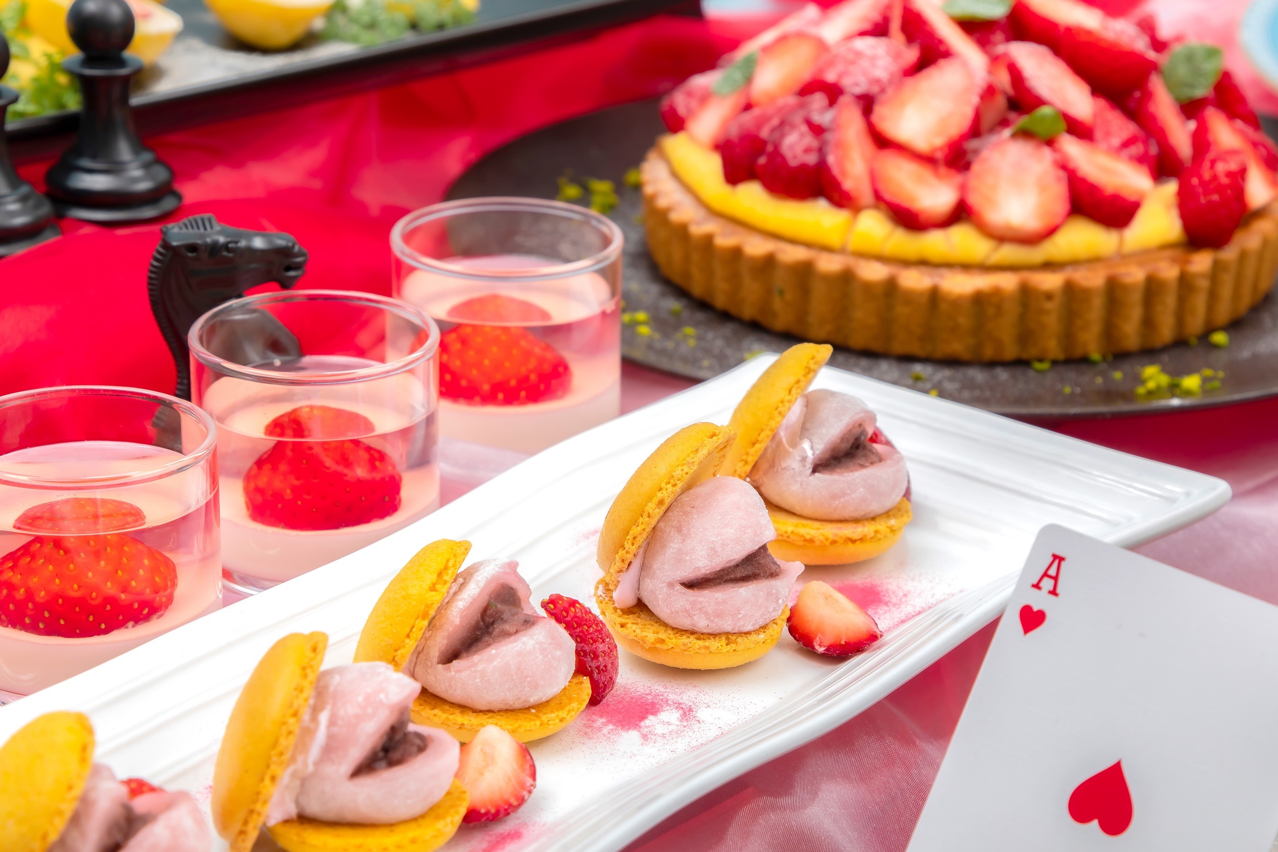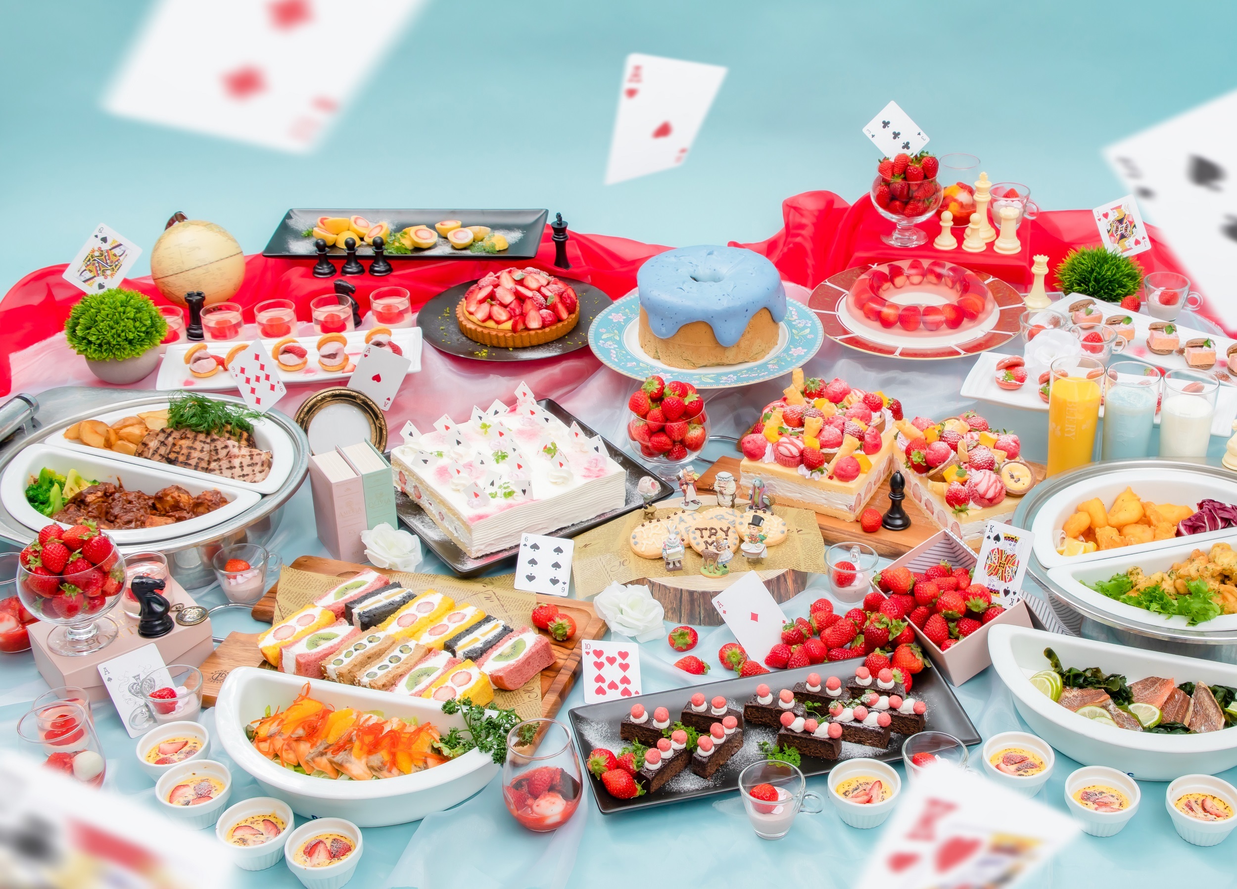本企画は、ルイス・キャロルの小説『不思議の国のアリス』からイメージされるシーンを、海洋堂(所在地:大阪府門真市)のフィギュアによる店内装飾やフォトスポットをプロデュースしていただきました。お料理は、いちごとスイーツで世界観を表現。トランプの兵士を飾ったケーキ、ドアノブとの掛け合いで出てくるEATMEクッキー、あおイモムシを連想させるロールケーキなど華やかさと可愛さいっぱいのスイーツに加え、和牛ネック肉の煮込みや、エビのフリッター、フライドポテトやフォカッチャピッツアなどもご用意。スイーツだけではなくお料理もバイキングスタイルで心ゆくまでお楽しみください。