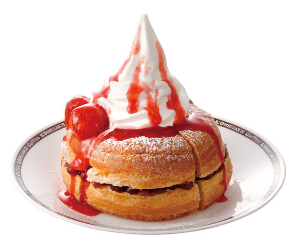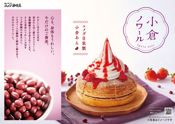 小倉あんのほっこりとした甘さが味わえることでファンも多い『小倉ノワール』。小豆には、たんぱく質やポリフェノール、食物繊維などが含まれていて身体にも嬉しい食材として近年注目されています。そんな小豆をつかった小倉ノワールは、ほかほかのデニッシュパンにサンドした小倉あんに、まろやかなソフトクリームと甘酸っぱい苺ソースが絡むことで小倉あんの甘さがより引き立つ、酸味と甘みが絶妙なバランスの和のシロノワールです。味の要となるあんこは、“コメダ自家製小倉あん”を使用。小豆本来の風味をより感じられる小豆好きにはたまらない味わいです。ソフトクリームの白色と苺ソースの赤色のコントラストで、見た目も美しい一品。みんなでシェアできる通常サイズと、おひとりさまや、食後のデザートにぴったりのミニサイズをご用意して、皆様のご来店をお待ちしております。小倉ノワールを味わいながらくつろぎの時間をお過ごしください。