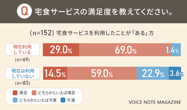 続いて、現在宅食サービスを利用している方と、以前宅食サービスを利用していたが現在は利用していない方に、宅食サービスの満足度について聞きました。