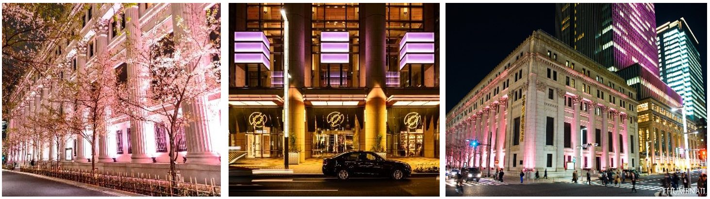 桜の季節の風物詩ともなった「桜ライトアップ」。中央通り沿いに並ぶ重要文化財や、大型のビル等の施設と、日本橋の桜の名所のひとつである「江戸桜通り」が桜色にライトアップ。