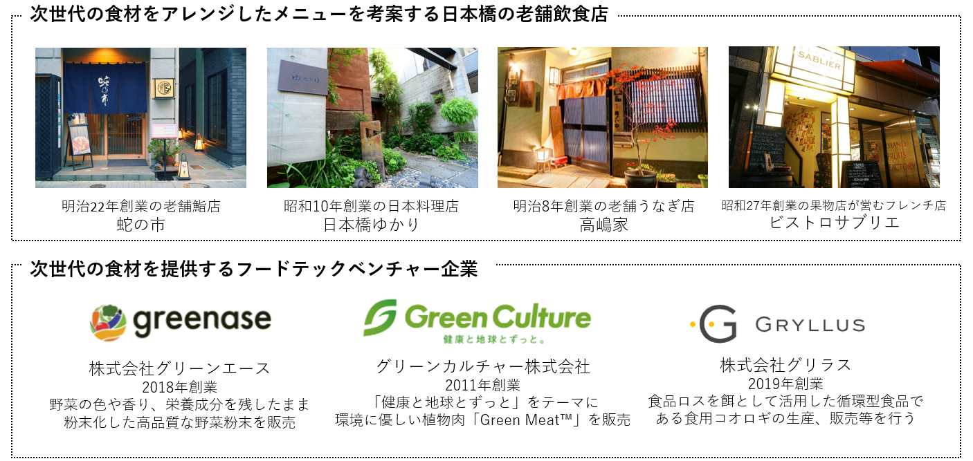 地球への負荷を減らすサステナブルな次世代食材を活用し、日本橋の名店がメニューを考案したお弁当の販売など、未来の食が身近に感じられるコンテンツもお届けします。