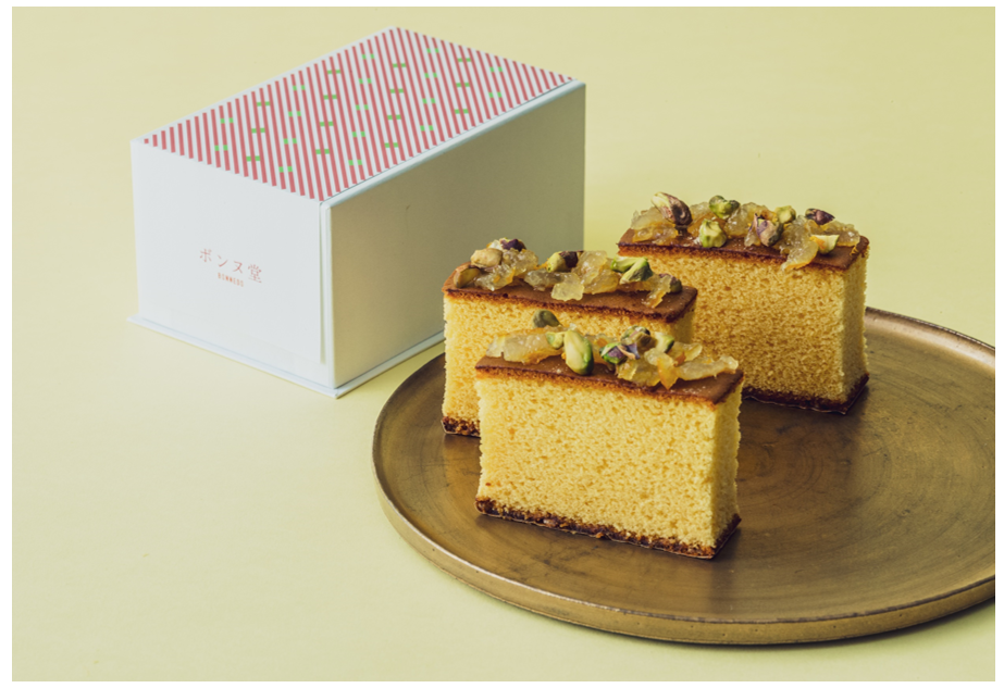日本橋江戸桜通りを拠点とするカステラの老舗・文明堂東京と、人気のカジュアルフレンチLa Bonne Tableのコラボから生まれた“洋生カステラ ボンヌ堂”。文明堂の看板商品であり、卵黄卵白の比率5:3の濃厚な味わいを持つ五三カステラと、ピスタチオの食感とカルダモンの香りが爽やかな柚子のコンフィチュールがマリアージュ。