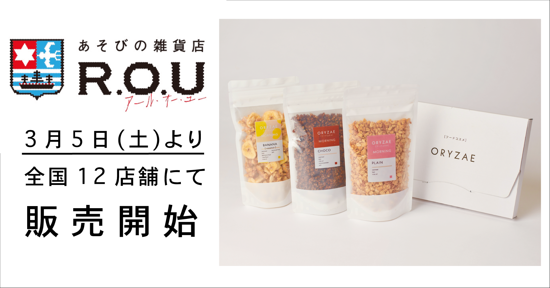 株式会社アグクル(所在地:東京都品川区、代表取締役:小泉泰英)が展開する、“手軽に腸活“をテーマとしたフードコスメブランド「ORYZAE(オリゼ)」は、2022年3月5日(土)より、R.O.U 株式会社(アール・オー・ユー)が運営するあそびの雑貨店:R.O.U(アール・オー・ユー)の全国12店舗にて、米麹グラノーラの販売を開始いたします。