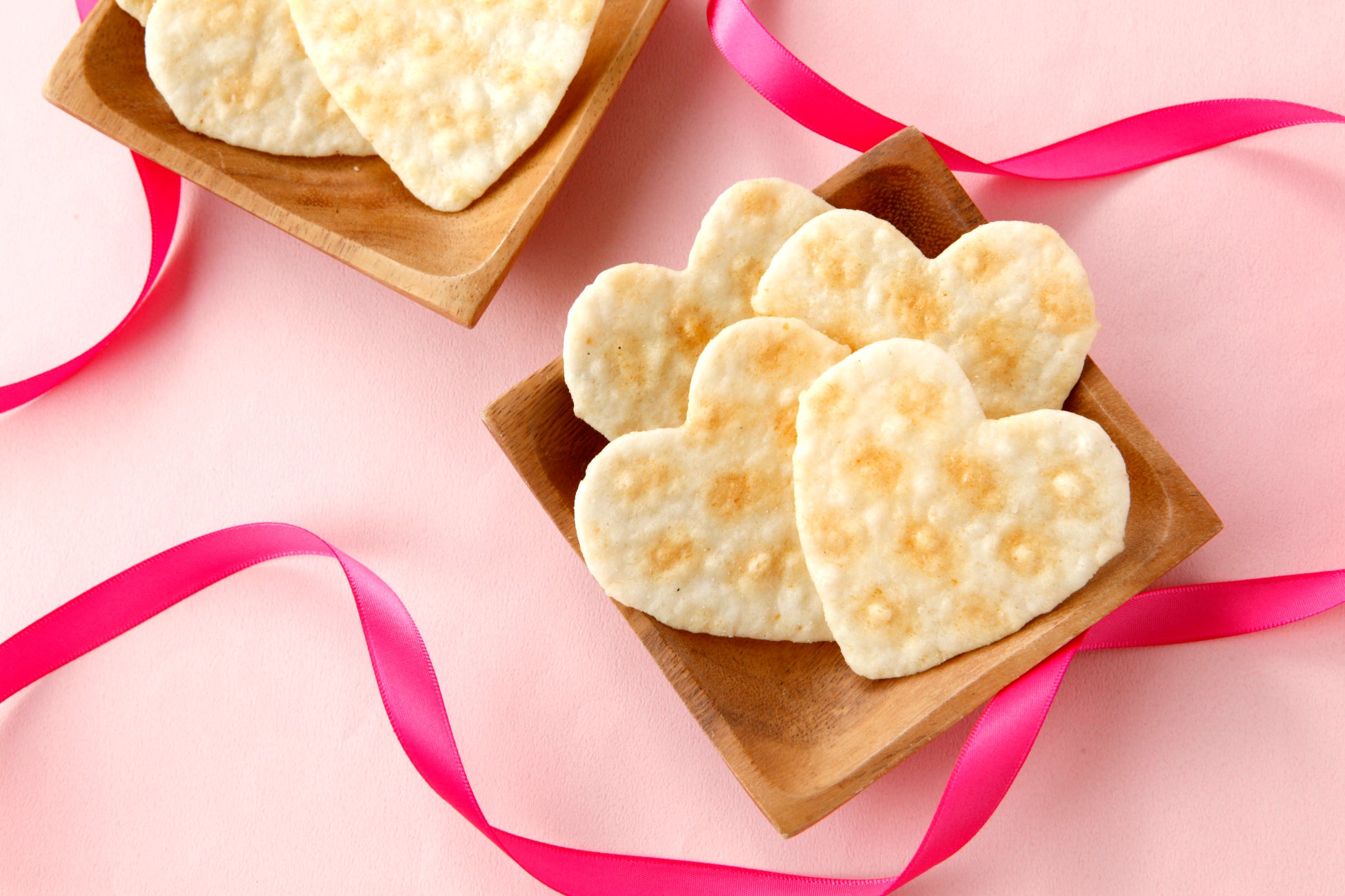 SHIRO SASARAYAのメイン商品 薄焼き・洋仕⽴て-しろえびせん-をかわいいハート型にした限定商品。