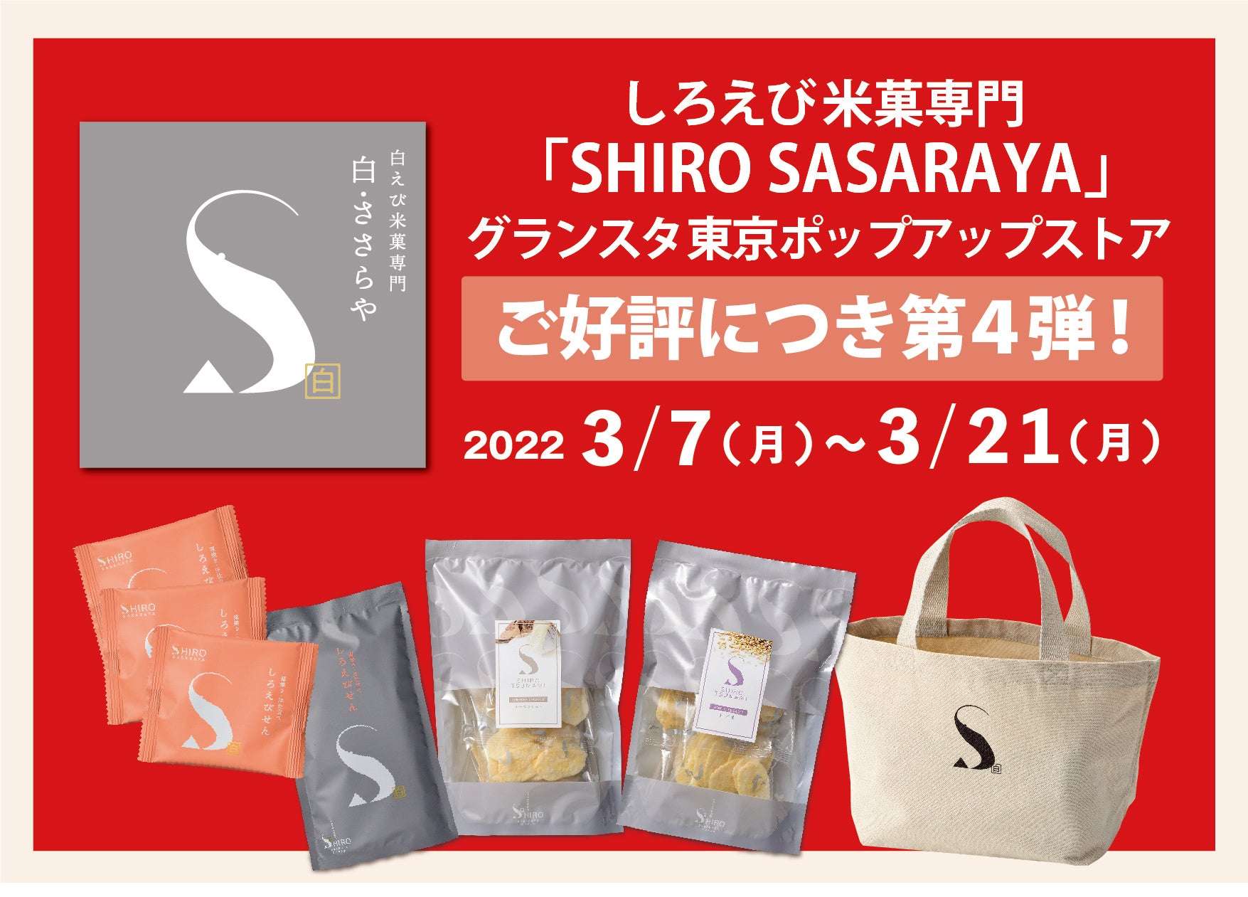 創業98年の⽼舗⽶菓メーカー⽇の出屋製菓産業株式会社(本社:富⼭県南砺市、代表取締役会⻑:川合 声⼀)より、新ブランド、しろえび⽶菓専⾨「SHIRO SASARAYA」が、グランスタ東京内「ポップアップグランスタ グリーン」にて2022年3⽉7⽇(⽉)〜3⽉21⽇(月)まで期間限定出店いたします。