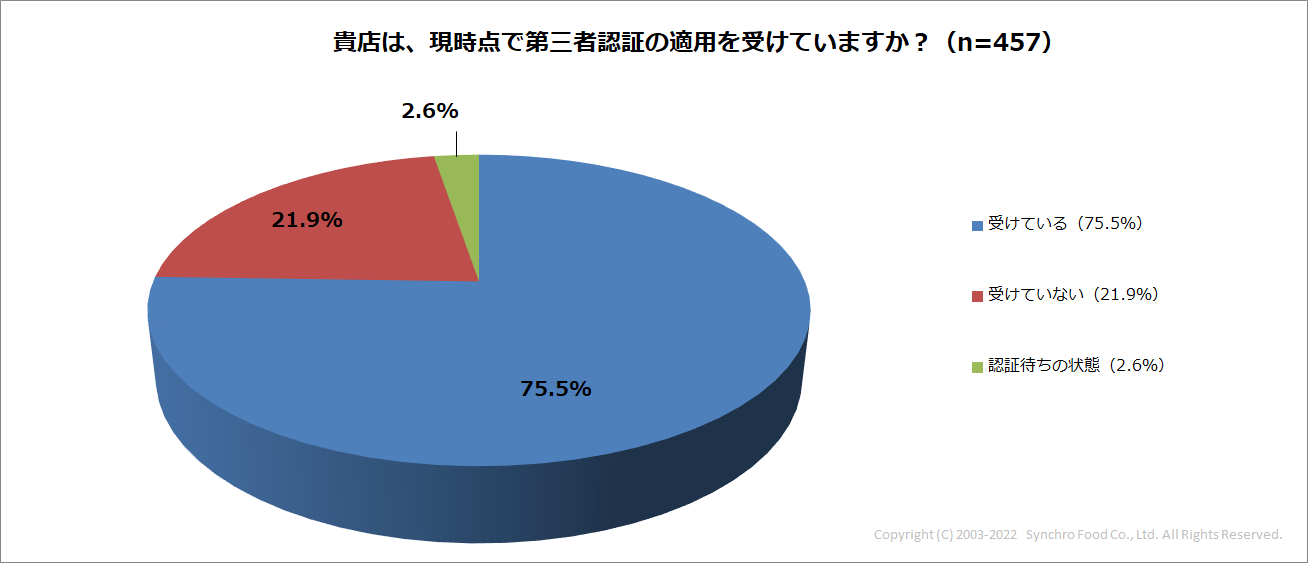 今回のまん延防止等重点措置では、自治体によっては、第三者認証の適用を受けている飲食店は要請内容を選択できるようになっています。そこで、第三者認証の適用状況を聞いたところ、75.5%の店舗が「受けている」と回答。また、「認証待ちの状態」という店舗も2.6%ありました。これに対し、「受けていない」との回答は21.9%にとどまっており、8割近くの飲食店が第三者認証を得ている状況が明らかとなりました。