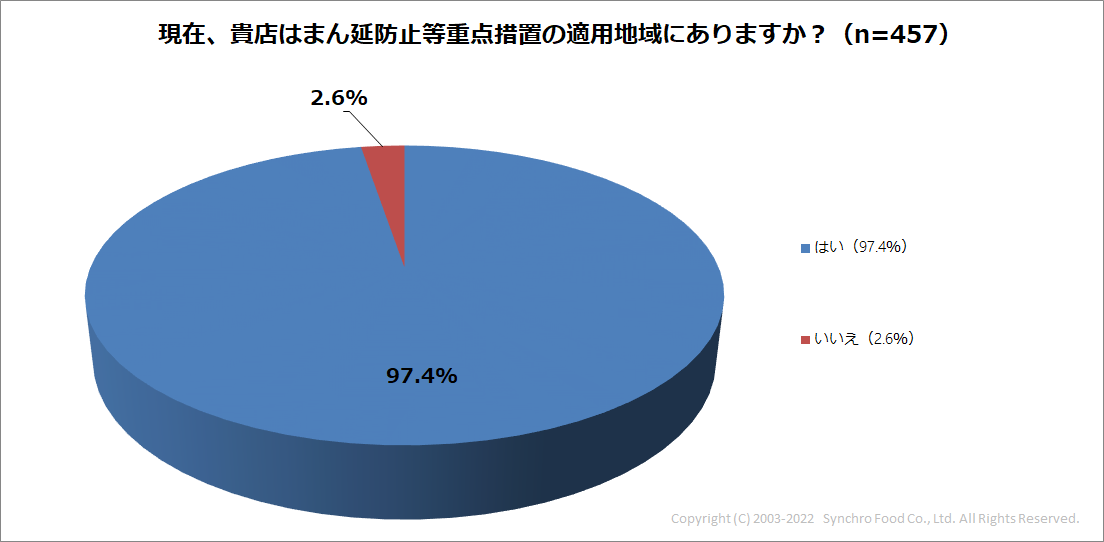 まず、アンケート回答者の店舗がまん延防止等重点措置の適用地域にあるかどうか尋ねたところ※、97.4%が「はい」と回答。「いいえ」と回答したのは、2.6%でした。