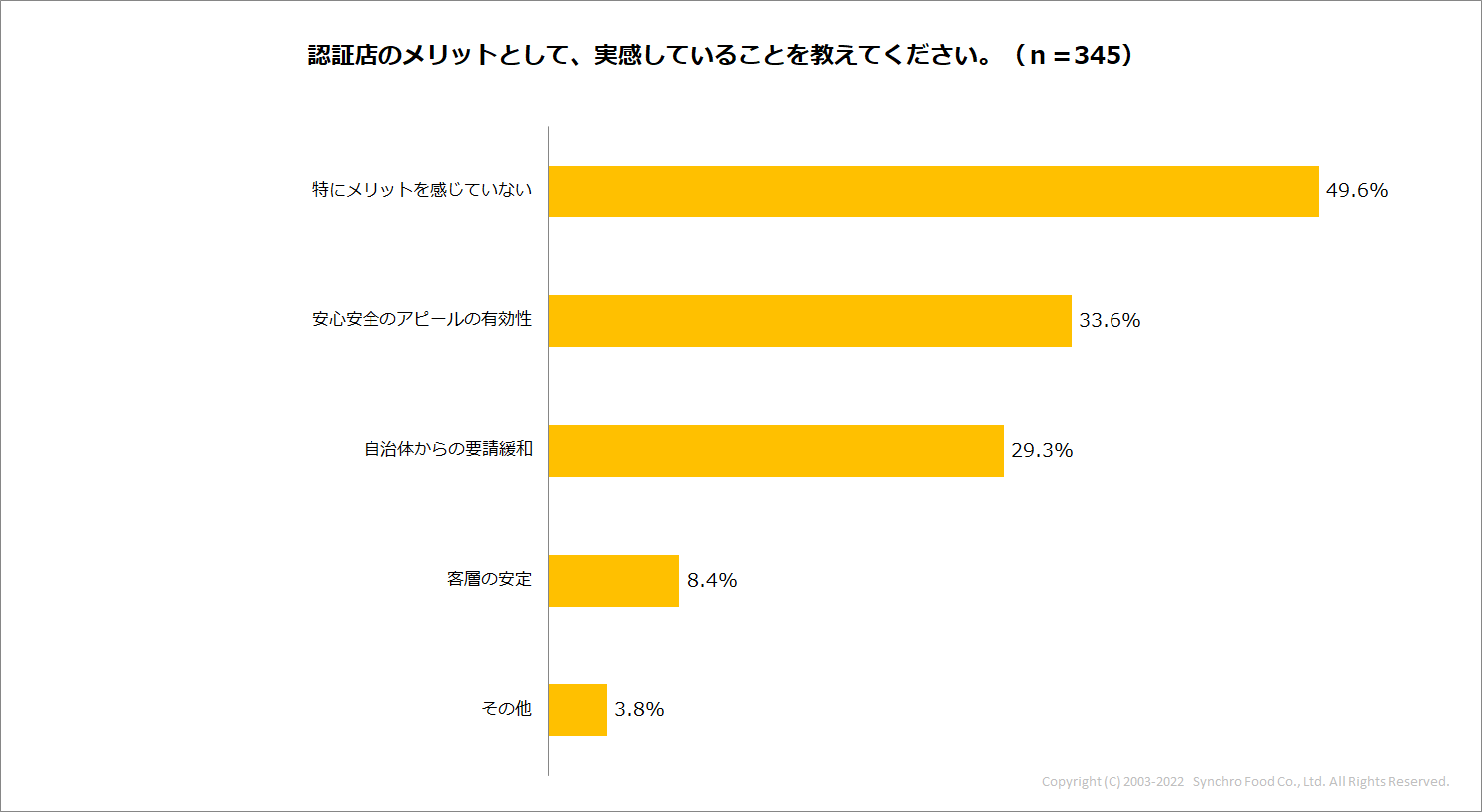 次に、第三者認証の適用を受けていると回答した店舗に、認証店のメリットを尋ねたところ、最多は「特にメリットを感じていない(49.6%)」との回答でした。これに、「安心安全のアピールの有効性(33.6%)」、「自治体からの要請緩和(29.3%)」との回答が続きました。