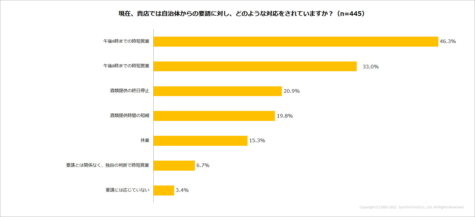 続いて、まん延防止等重点措置の適用地域にある飲食店に対し、自治体の要請に対する対応状況を聞いたところ、最多は「午後9時までの時短営業」との回答で、46.3%。次いで、「午後8時までの時短営業(33.0%)」、「酒類提供の終日停止(20.9%)」との回答が続きました。何らかの形で要請に応じている飲食店が多い一方で、「要請には応じていない」との回答も3.4%ありました。