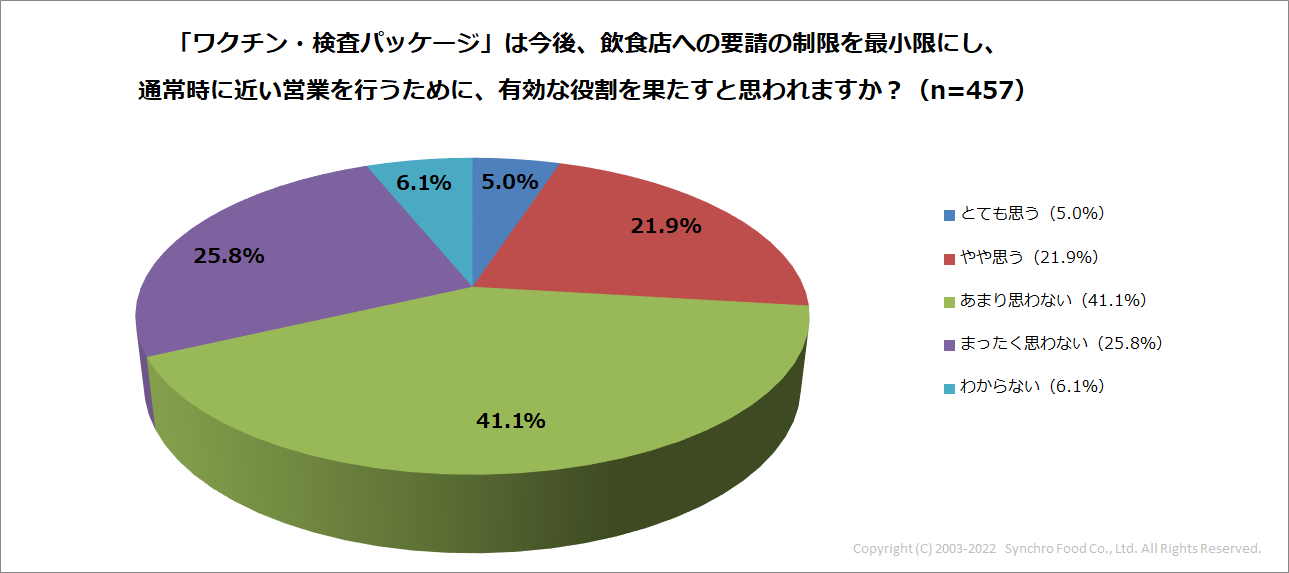 ワクチン・検査パッケージ制度については、自治体ごとに運用方針が異なっていますが、今後、同制度が飲食店に対する要請の制限を最小限にし、通常時に近い営業を行うために有効な役割を果たすと思うか尋ねました。