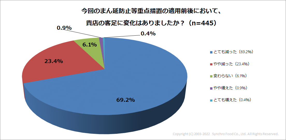同じく、まん延防止等重点措置の適用地域にある飲食店に対し、まん延防止等重点措置の適用前後における客足の変化について尋ねたところ、最も多かったのは「とても減った(69.2%)」との回答でした。「やや減った(23.4%)」との回答と合わせると、92.6%もの店舗が客足の減少を実感していることが明らかとなりました。一方で、「やや増えた(0.9%)」、「とても増えた(0.4%)」という、客足の増加を感じた店舗は1.3%でした。