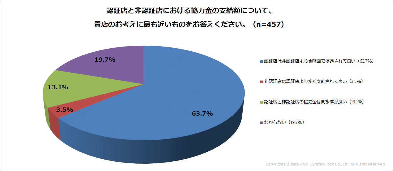 また、現在、要請に協力した飲食店に対しては協力金が支給されていますが、認証店と非認証店における協力金の支給額についてどのような考えを持っているのか聞きました。最も多かったのは「認証店は非認証店より金額面で優遇されて良い(63.7%)」との回答で、6割を超える飲食店から認証店の優遇を求める声が寄せられました。次いで、「わからない(19.7%)」、「認証店と非認証店の協力金は同水準が良い(13.1%)」との回答が続きました。