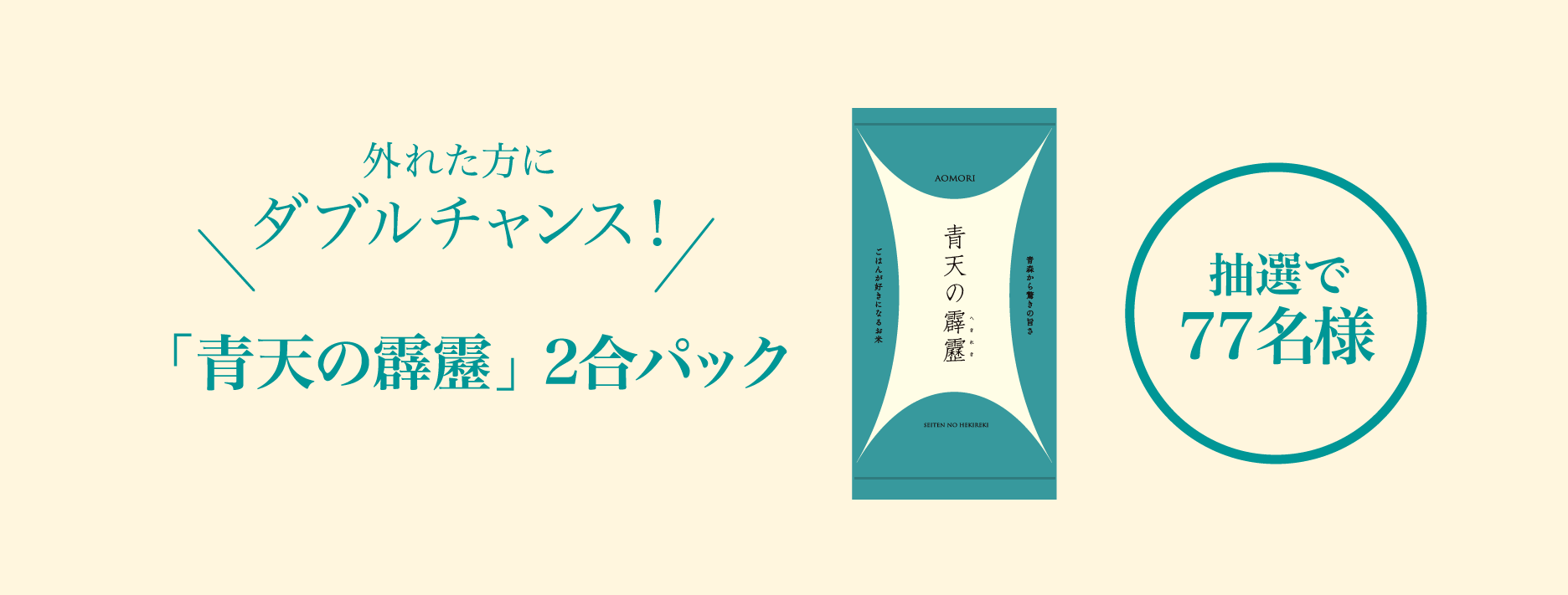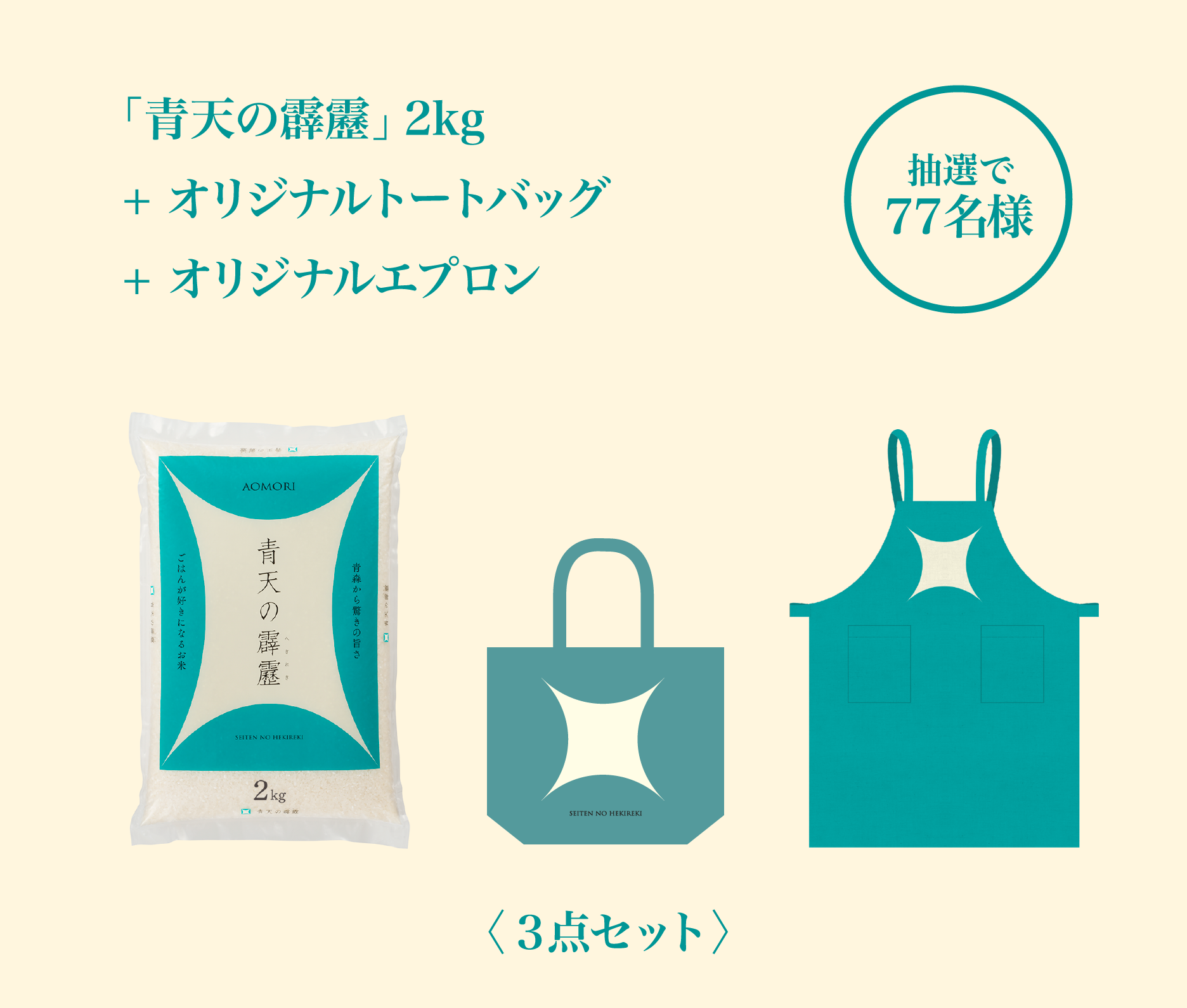 このたび青森県はみなさまへの感謝をこめて、青天の霹靂とオリジナルグッズが当たるクイズプレゼントキャンペーンを実施いたします。青天の霹靂のWEBムービーに関する問題に正解した方の中から抽選で77名様に、「青天の霹靂2kg+オリジナルトートバッグ+オリジナルエプロン」のセットをプレゼント。さらにダブルチャンスとして、惜しくも抽選に外れた方の中から77名様に、「青天の霹靂2合パック」1袋を差し上げます。