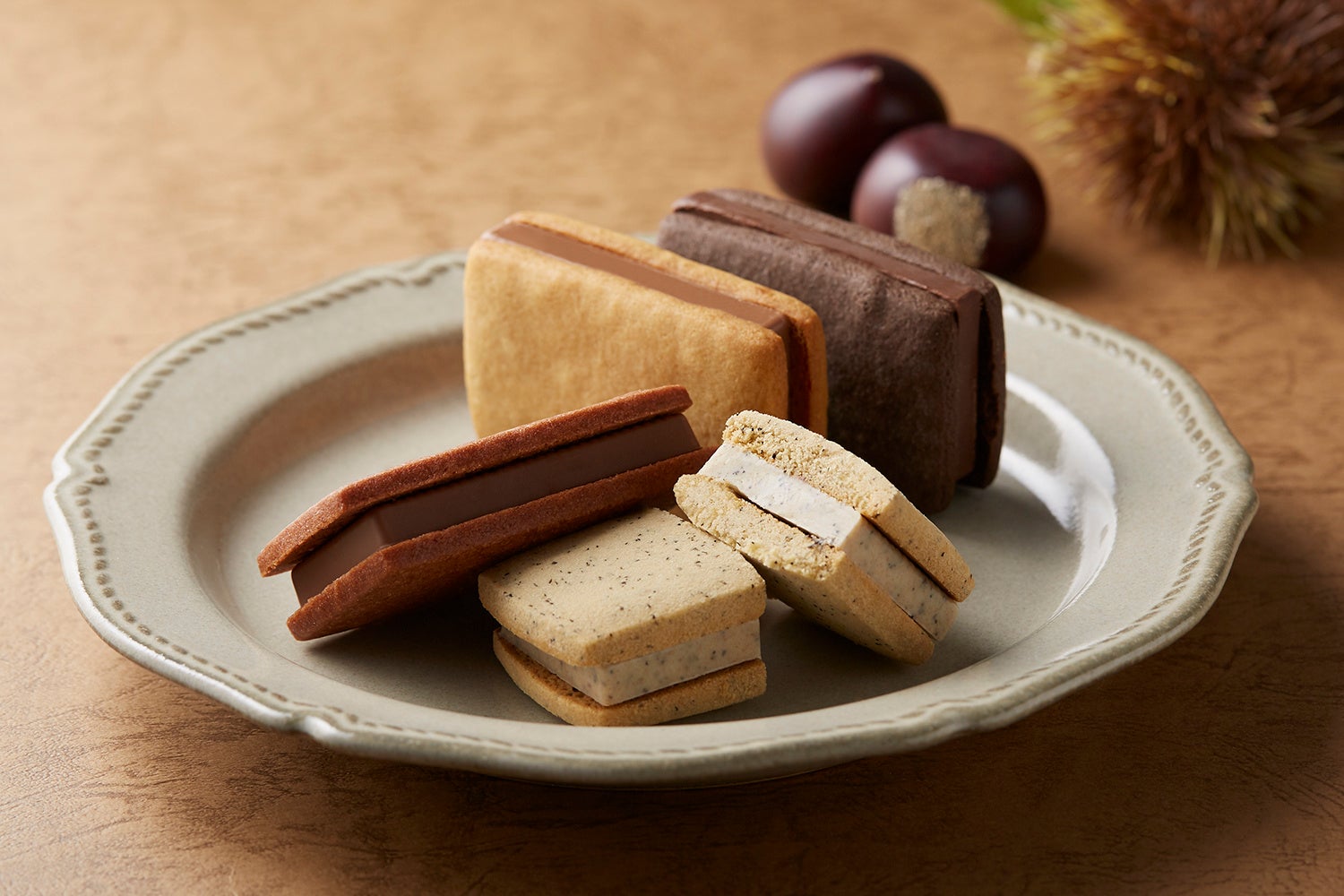 「ビター」と「キャラメル」に加え、ショコラとクッキーに紅茶葉を練りこんだ香りの良い「ロイヤルミルクティー」と、しっかりとした栗の風味を感じていただけるイタリア産の栗を使用した「イタリアマロン」の季節のショコラサンドをご用意しています。