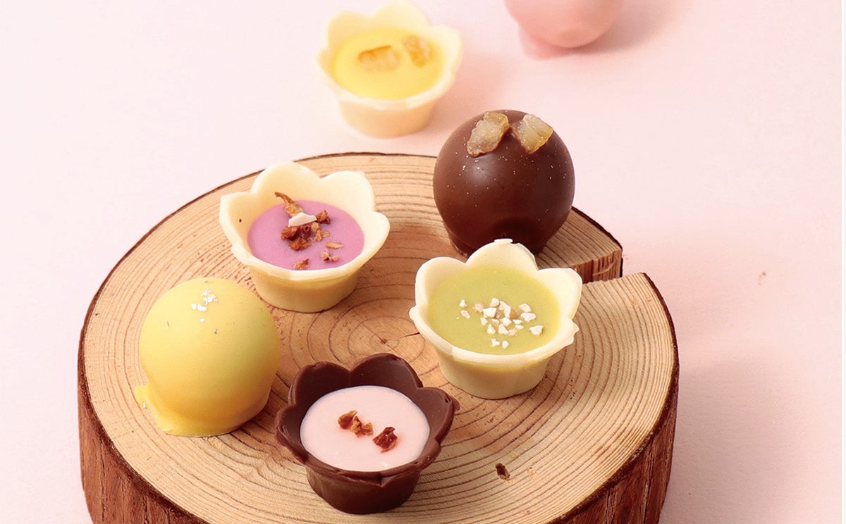 ビター、ミルク、ホワイトの3種のショコラを使い分け、2トーンやマーブル模様など見た目にも華やかに仕上げました。