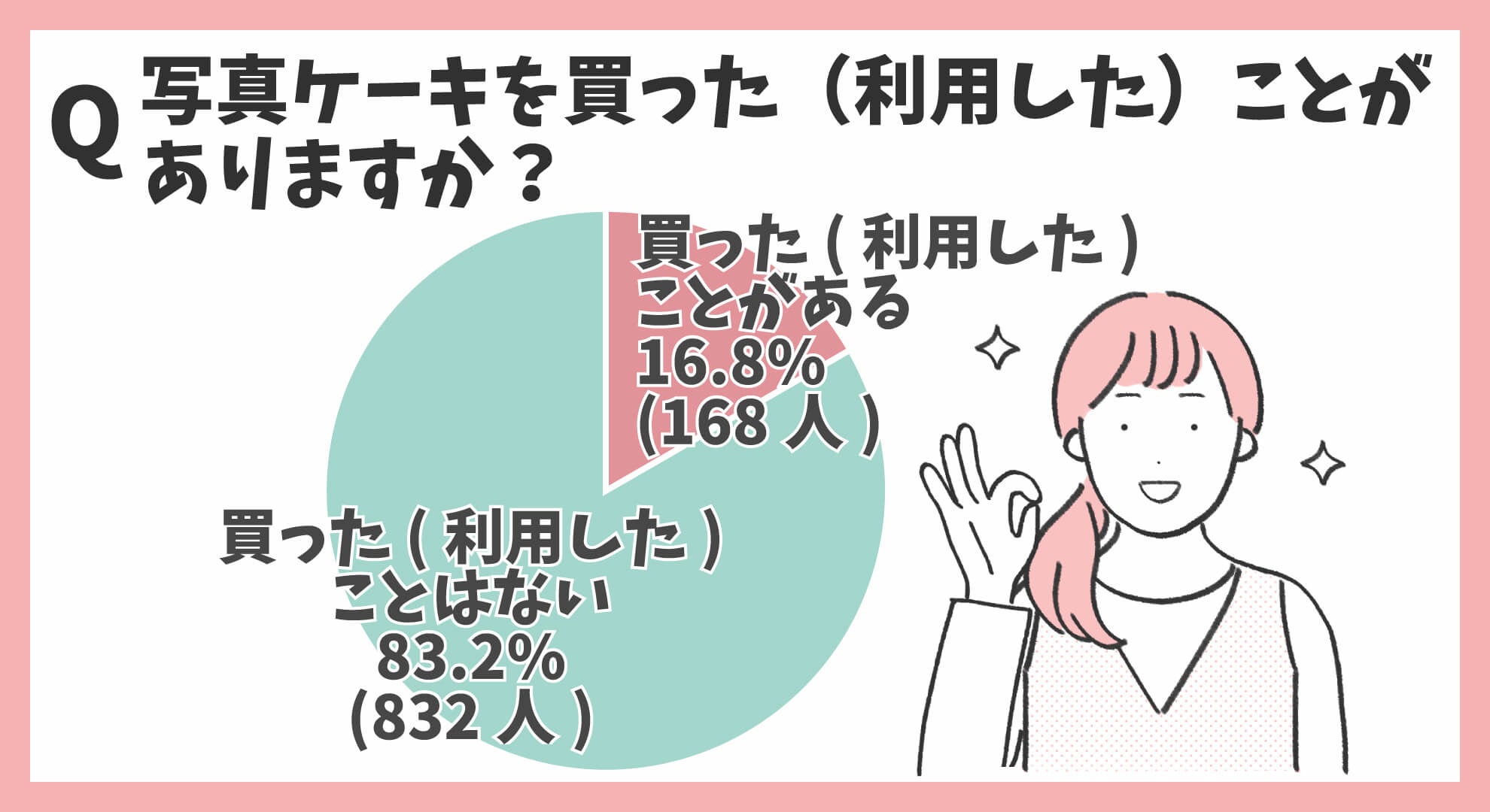 写真ケーキの利用経験を調べたところ、「買った(利用した)ことがある16.8%(168人)」「買った(利用した)ことはない83.2%(832人)」という結果になりました。