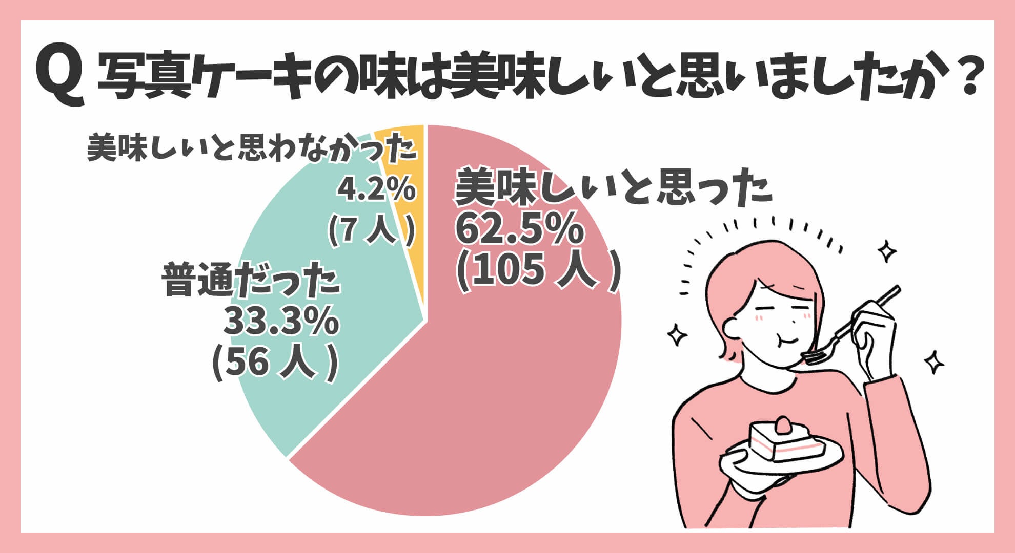 写真ケーキの味について調べたところ、「美味しいと思った62.5%(105人)」「普通だった