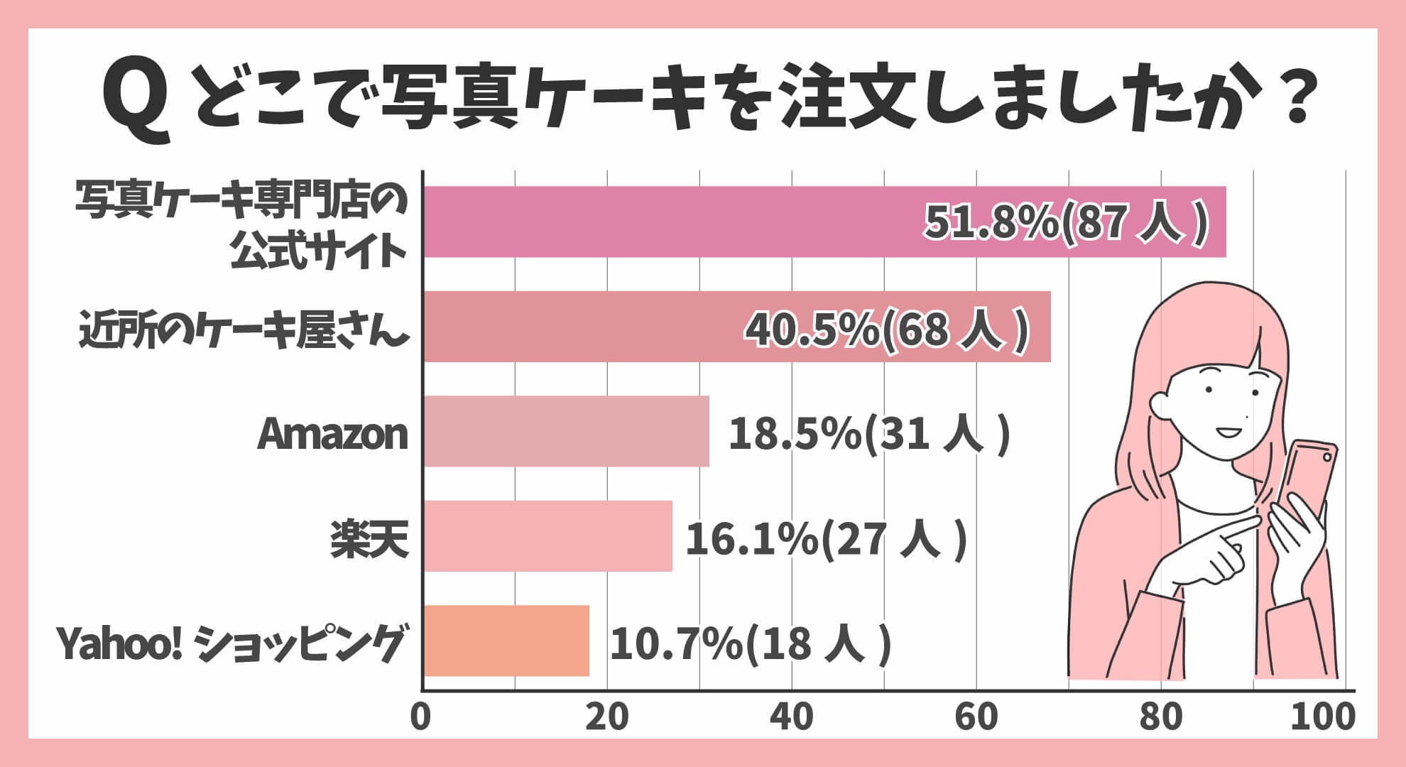 なお「Amazon」「楽天」「Yahoo!ショッピング」などの大手通販サイトで写真ケーキを注文した方は、10.7%(18人)~18.5%(31人)と少なかったです。