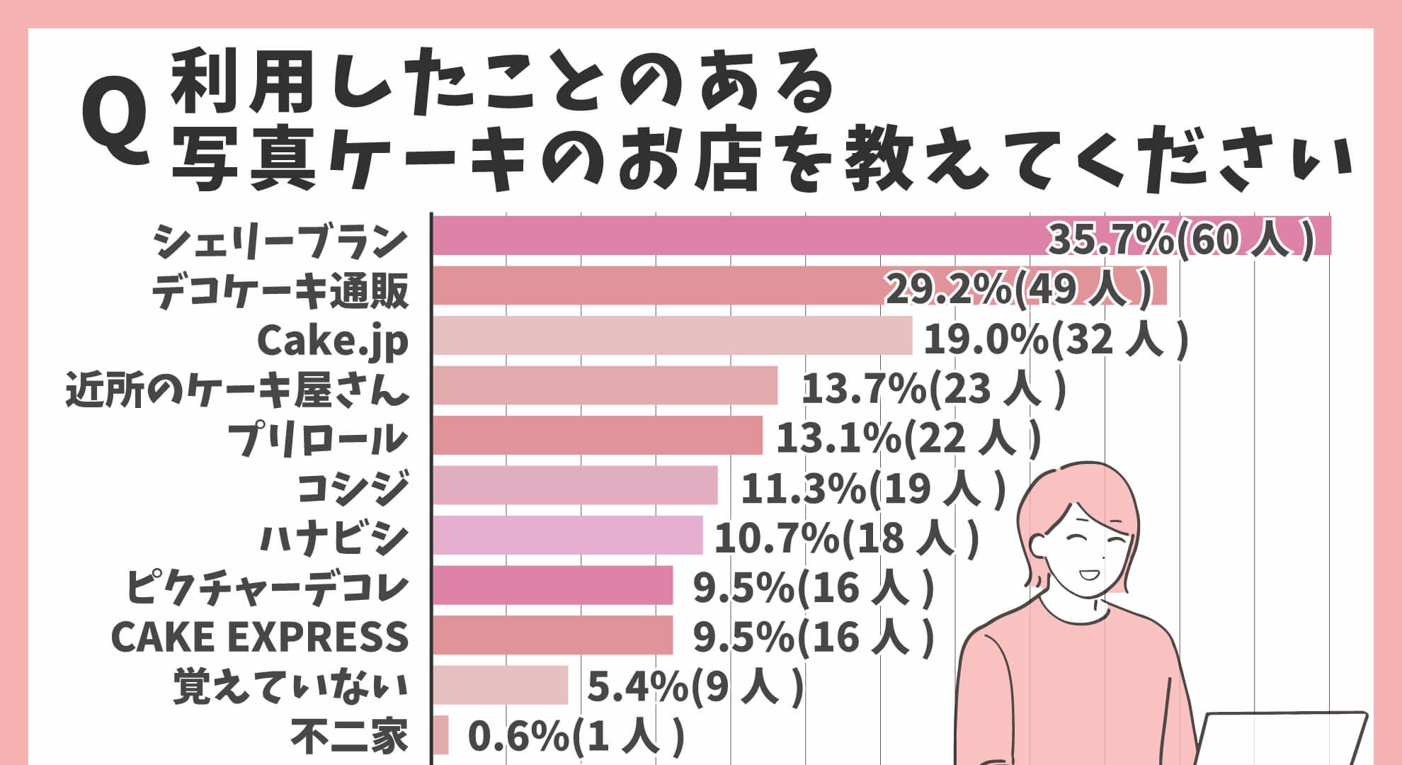 利用したことのある写真ケーキ店を調べた結果、「シェリーブラン35.7%(60人)」が最多でした。以降は、「デコケーキ通販29.2%(49人)」「Cake.jp 19.0%(32人)」と続きます。