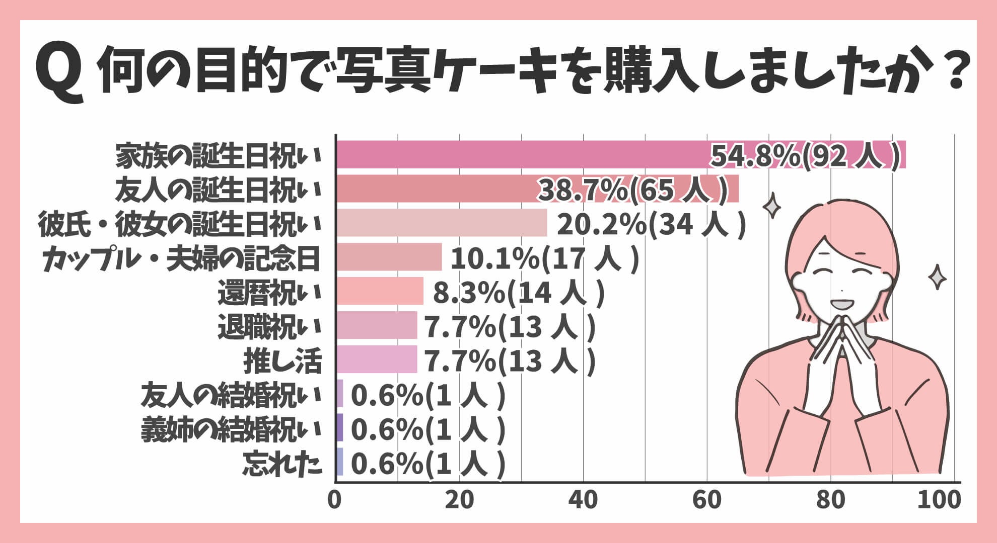 写真ケーキの利用目的を調べたところ、「家族の誕生日54.8%(92人)」が最多でした。次いで多かったのは「友人の誕生日38.7%(65人)」「彼氏や彼女の誕生日20.2%(34人)」です。