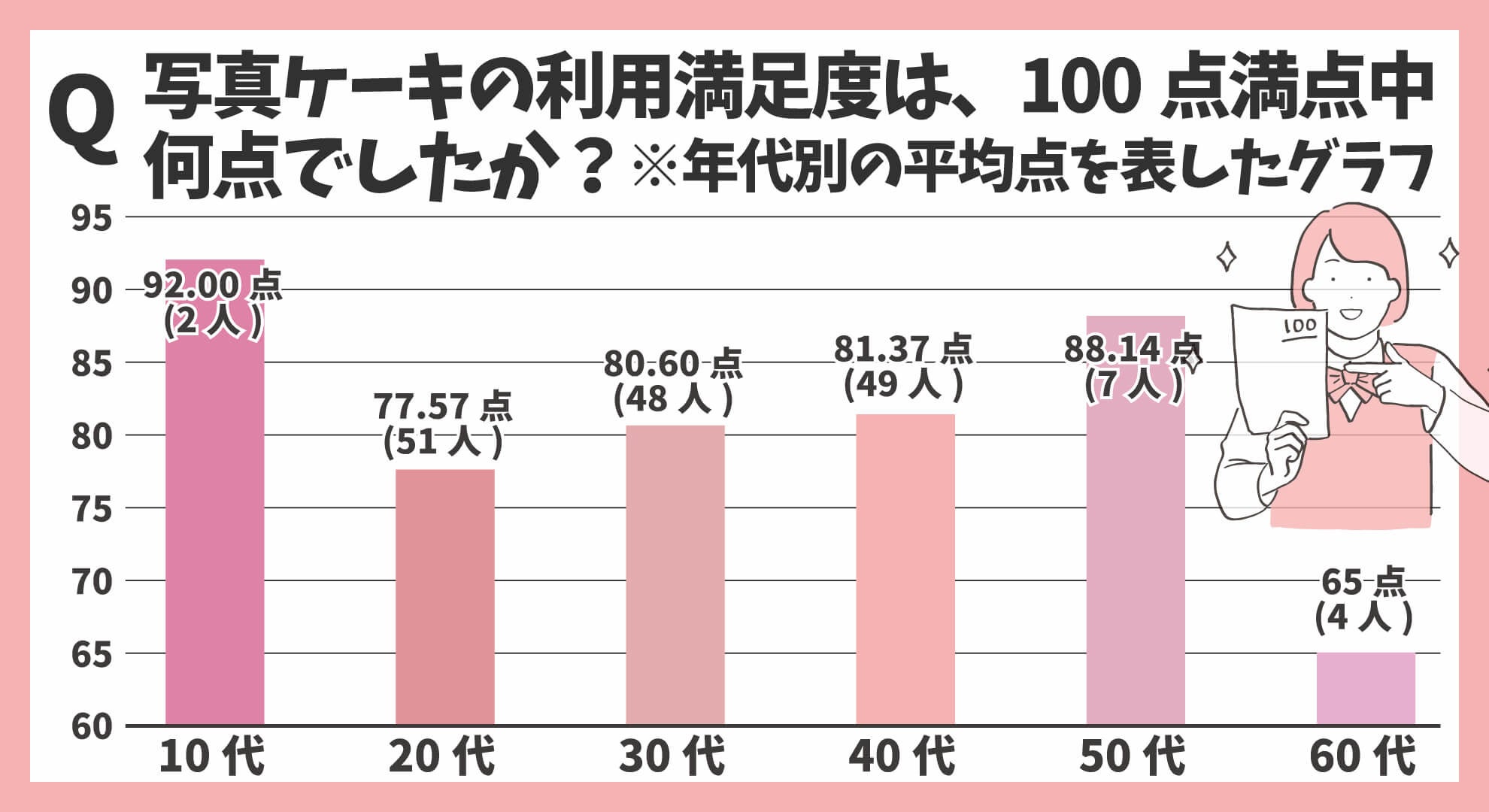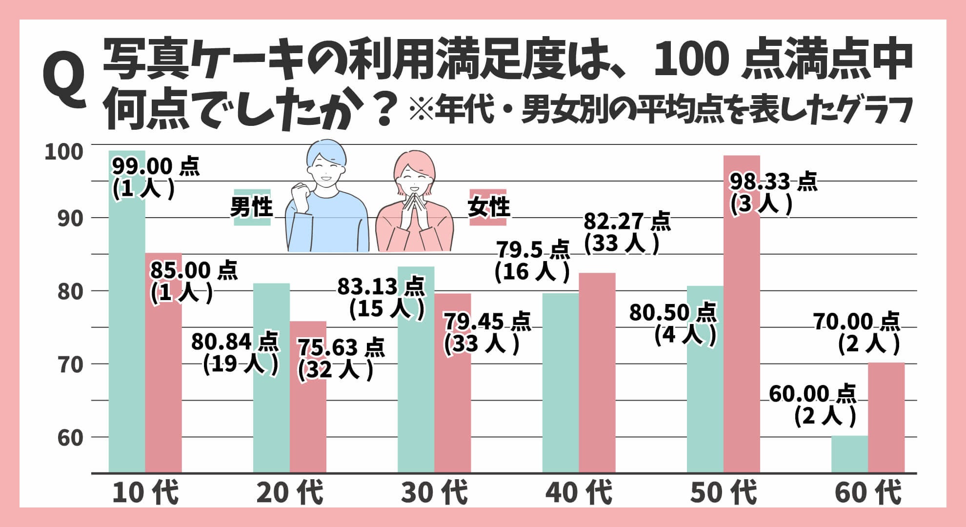 写真ケーキの利用満足度平均は、100点満点中79.96点でした。10代~60代における年代別、写真ケーキの利用満足度平均は下記の通りです。