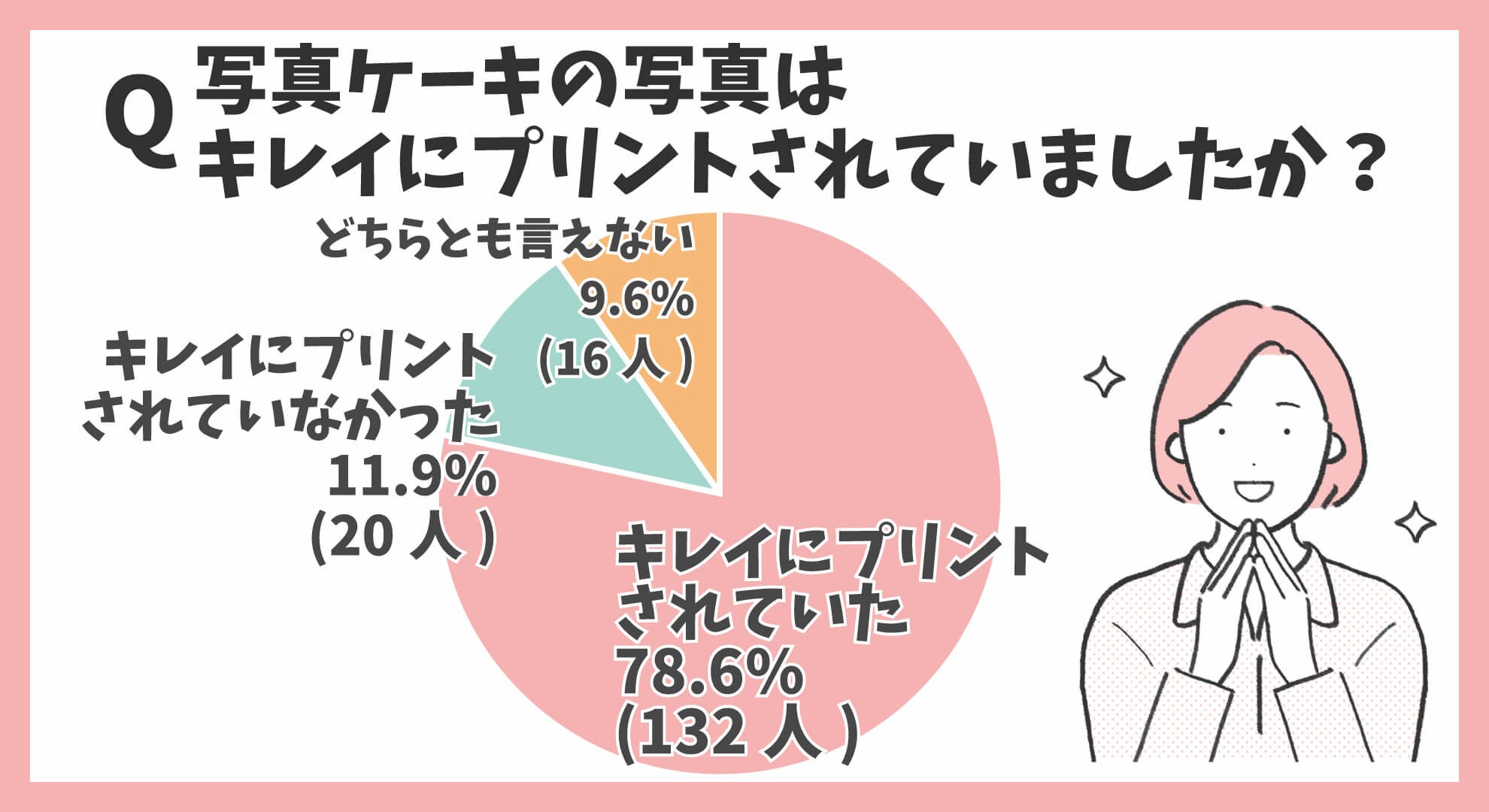 写真ケーキの写真の美しさについて調べた結果、「キレイにプリントされていた78.6%(132人)」「キレイにプリントされていなかった11.9%(20人)」「どちらとも言えない9.5%(16人)」という結果に。