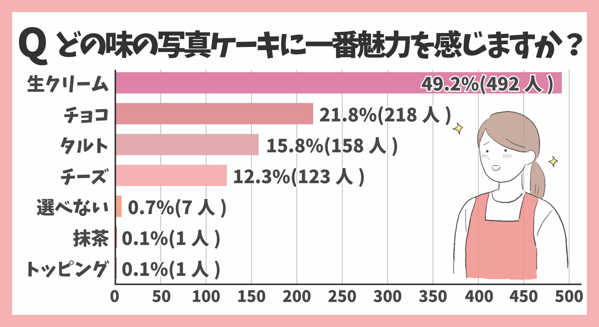 ■写真ケーキの味は1位「生クリーム49.2%(492人)」2位「チョコ21.8%(218人)」