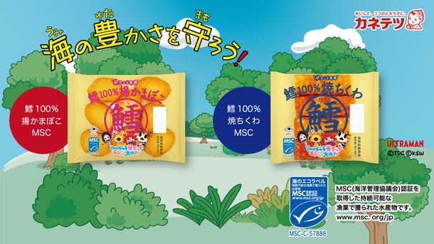 カネテツデリカフーズでは、現在、MSC認証のアラスカ産スケソウダラを100%使用した「鱈100% 揚かまぼこ MSC」と「鱈100% 焼ちくわ MSC」を商品化し、水産資源保全活動に参画しています。